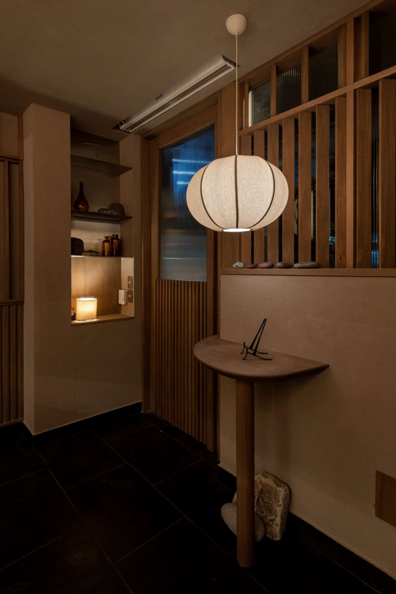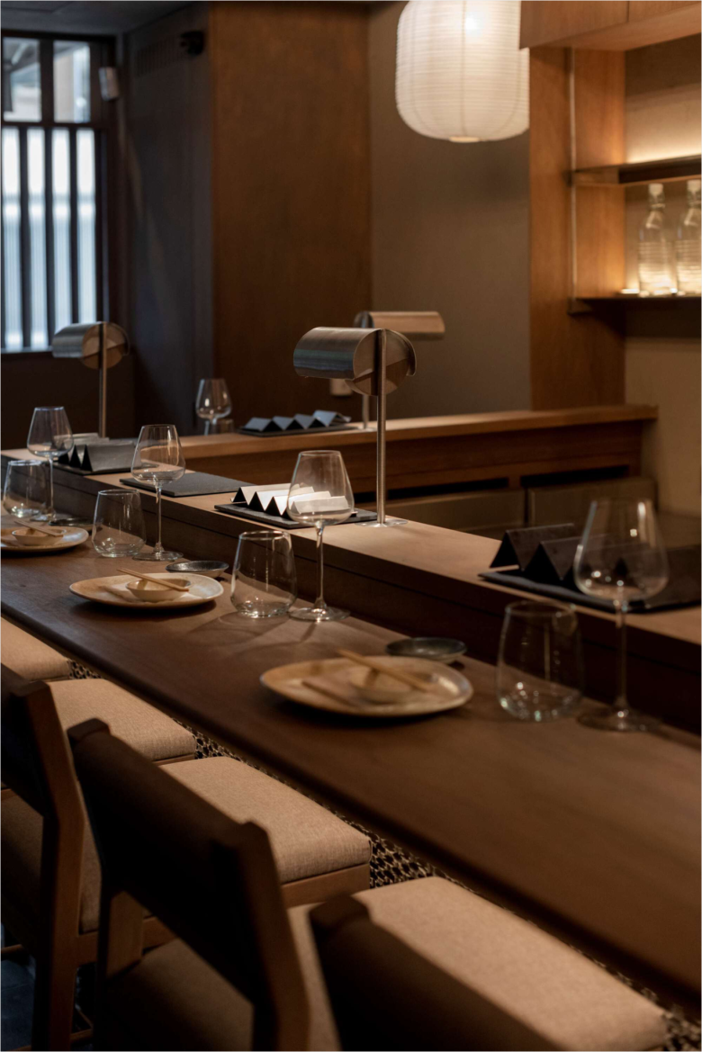 The volume seats eleven guests who sit on comfy cushioned stools. Each piece of furniture is custom-made for UKE, including the table lamps at the bar, and tweaks were applied while the space was taking shape. Interestingly, the setting and atmosphere is built on a Japanese understanding of the importance of darkness, and is similar to traditional Izakayas in the Land of the Rising Sun. As such, fabric and paper lamps have specifically been selected as they filter the light, creating the right warmth and intimacy for the compact space. The chosen material palette, which, next to the infusion of dark timber, also includes steel and black slate, all add to creating an intimate ambiance. In the bathroom, a neon-red light and steel faucets offer an unexpected, almost cinematic gesture. As said, UKE is a hand roll restaurant, and the menu lists a freshly made, large variety with different fish toppings, in addition to a selection of alcoholic and non-alcoholic beverages. © superfuture