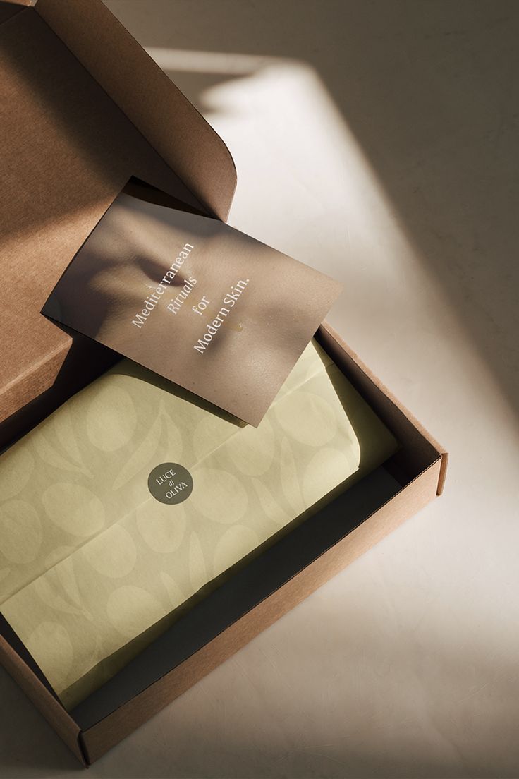 Packaging so beautiful you hesitate to throw the box away. Each detail invites the hand through textured papers, subtle embossing, and gold foil that glows like late-afternoon sun on olive leaves.