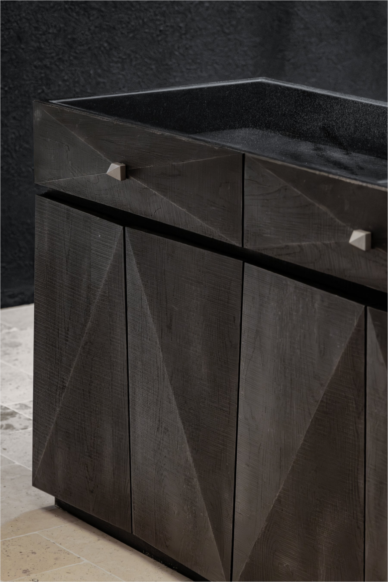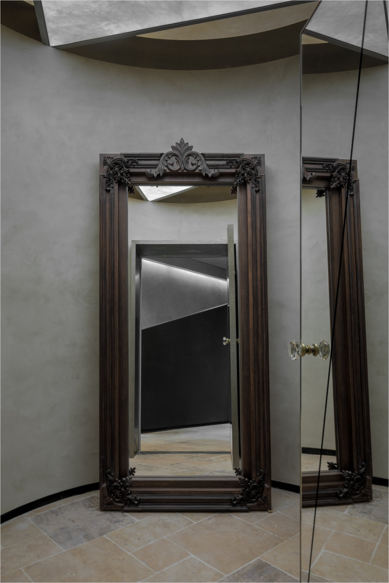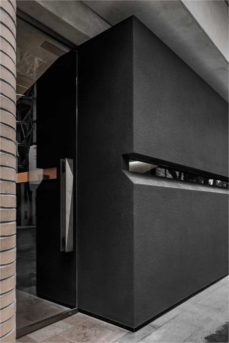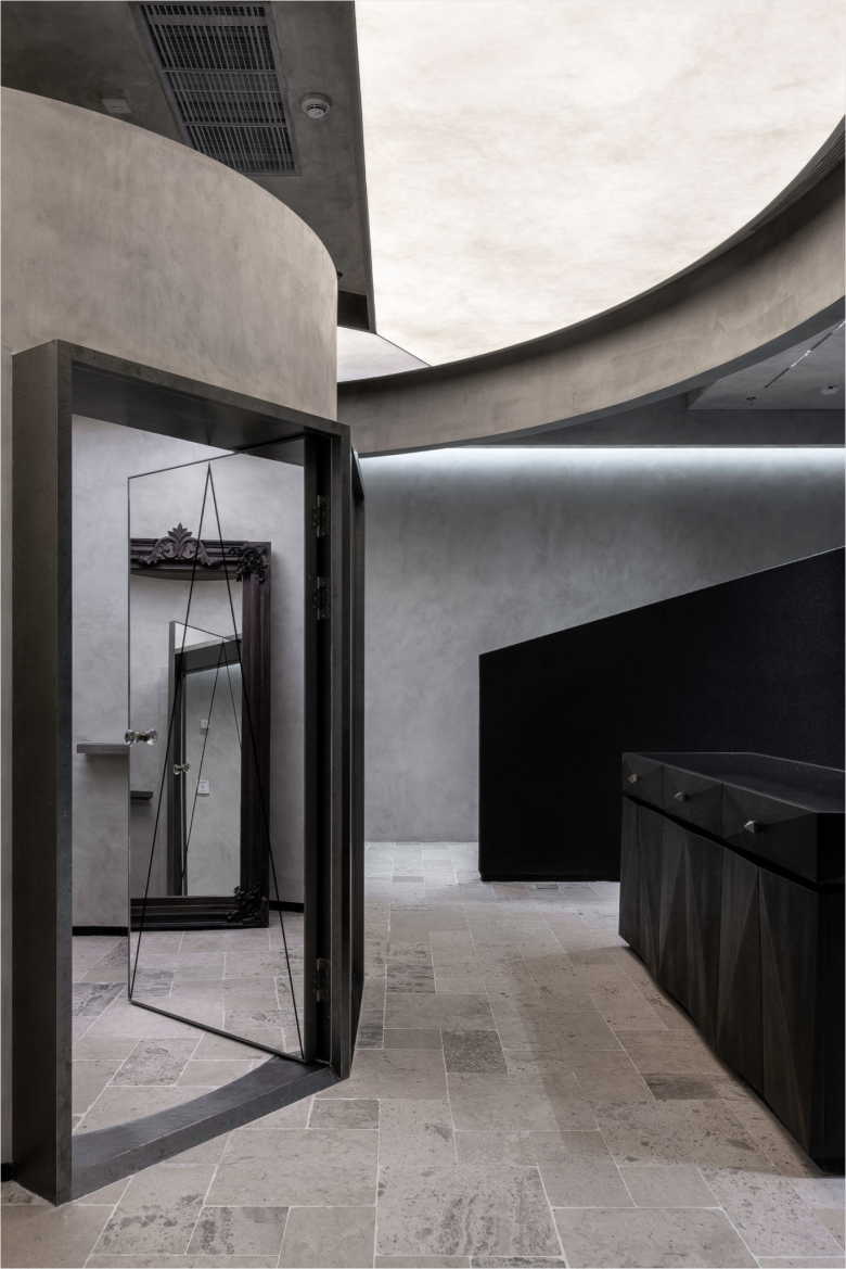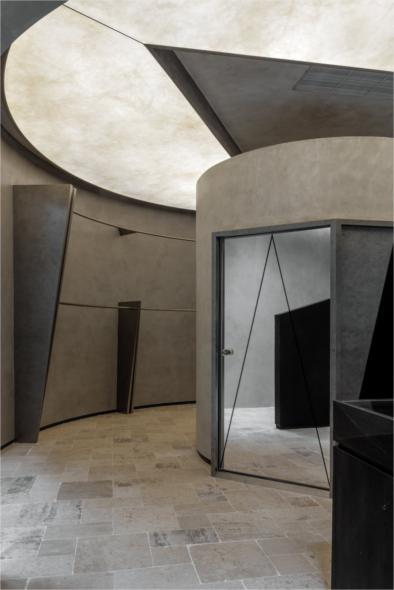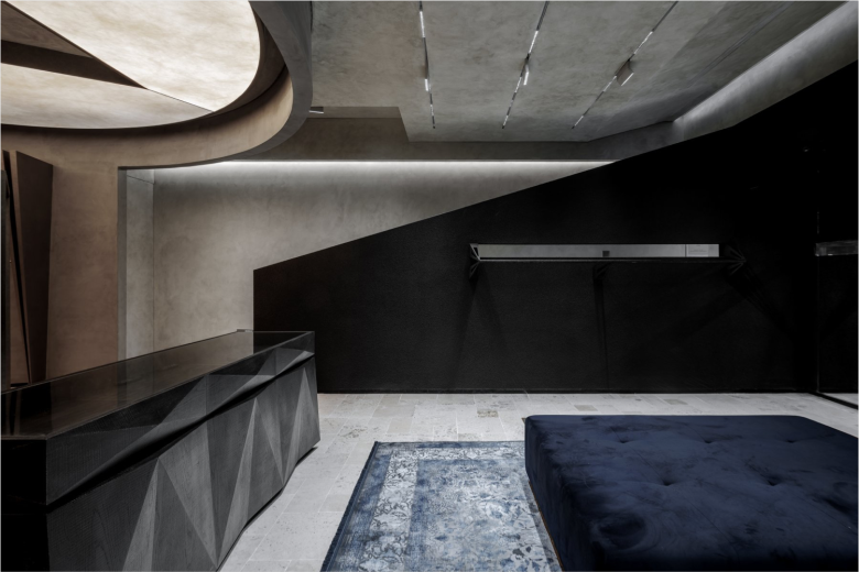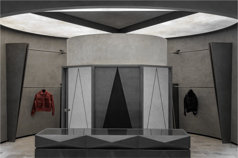 Both entrances are followed by corridors which lead to theboyhasnopatience‘s inner sanctum where coveted merchandise is on display. Given an unusual configuration, immersive setting and use of understated materials, the carefully created ‘mystical’ aura of the façade effortlessly extends inside. A large square ottoman is flanked on either side by apparel display areas, while a geometrically sculpted timber counter demarcates the store’s back section. Here, a sizeable circular volume houses a fitting room while a semi-circular back wall offers additional apparel display space and conceals storage space at the same time. The aforementioned material palette includes micro cement, black metal, silver metal and timber creates an austere, timeless setting, and one which seamlessly aligns with theboyhasnopatience‘s core essence. The new theboyhasnopatience store carries the brand’s full range of menswear. © superfuture