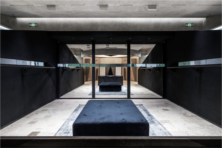 The reach of Chonqing-based DJ CELL is one that goes beyond music, encompassing also style and fashion, initially thanks to his streetwear label WHOOSIS, founded in 2015, but as of late, also through spin-off brand theboyhasnopatience. The latter has been shifting gear, and following an ephemeral space in Shanghai, the undisputed lifestyle hub of Chinese youth, it has now inaugurated a standalone store in the city’s Jing’an district. The theboyhasnopatience store occupies a 100 sqm. (1,076 sq.ft.) unit on the premises of a modern structure, and features an interior design by FON STUDIO, the same practice which designed the preceding pop-up store. Intricately constructed, the retail space features a semi-blind façade that’s forensically cut open in the middle and flanked on either side by glass doors, creating bold discretion and evoking curiosity at the same time.