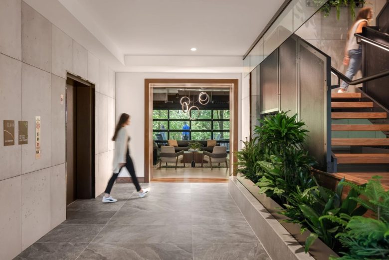 The design is guided by three drivers: sustainability, employee wellbeing, and collaboration. At the heart of the concept is connection, expressed in the seamless flow between exterior and interior, a dramatic entry sequence, a completely rebuilt grand stair, and a central sight line running the length of the building. To achieve this transformation, the front facade was expanded and the interior nearly gutted. This ambitious scope was proudly led entirely by the interior design studio.