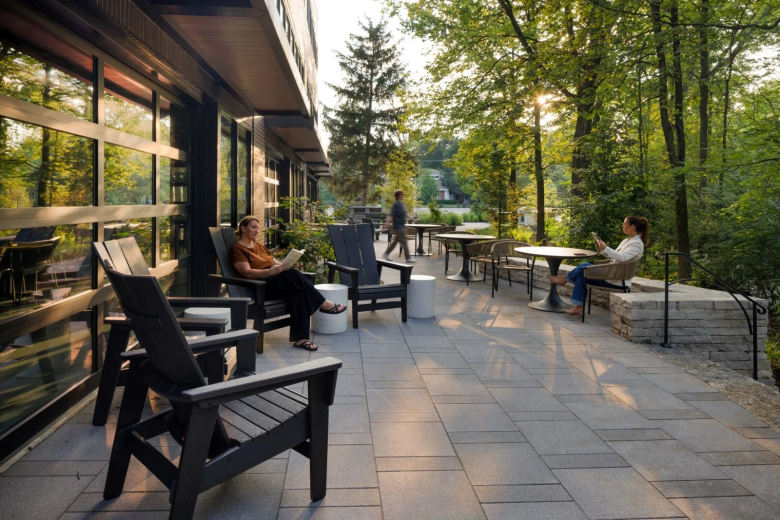 Wellness is supported through a layered amenity strategy including an expansive café, coffee bars on each floor, treadmill rooms, individual restrooms and showers, and mothers’/respite rooms. Beyond the walls, three outdoor patios and a walking path extend the culture of wellbeing into the landscape.
