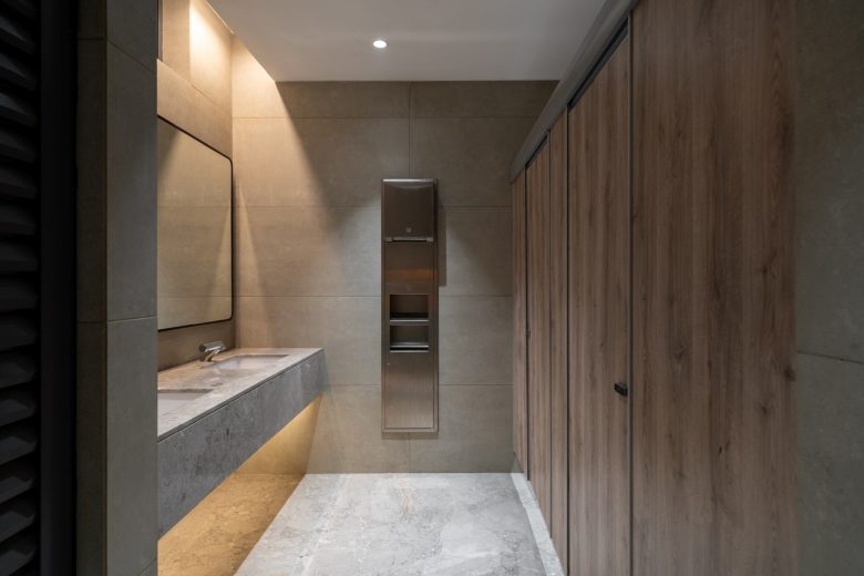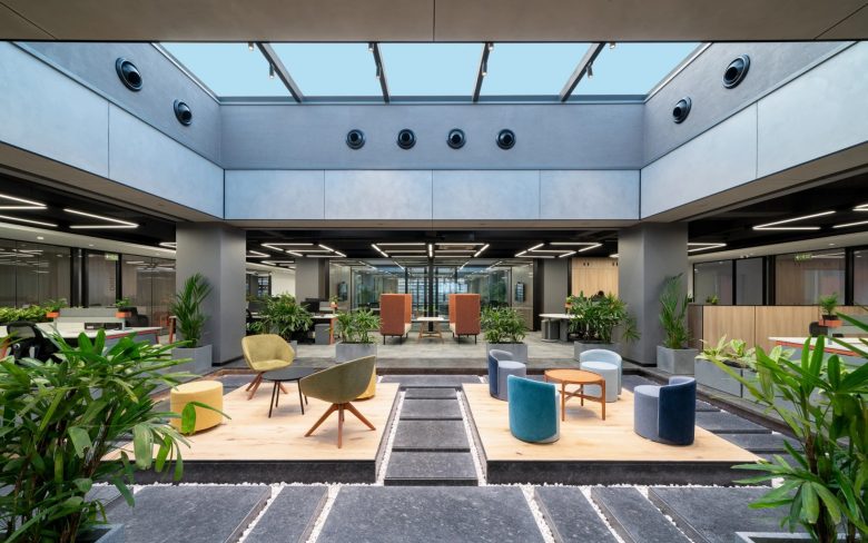 The design balances space efficiency with user comfort, moving away from typical high-density layouts. Smaller clusters of desks offer privacy, reduce noise, and boost productivity. Recreational areas are spread across both floors, ensuring easy access from any desk. Two courtyard-style lounge spaces under large skylights act as focal points, furnished with mid-century style furniture and lush plants. These areas enhance the outdoor feel and flood natural light into surrounding spaces, creating a calming atmosphere. This approach aligns with biophilic office interiors principles.