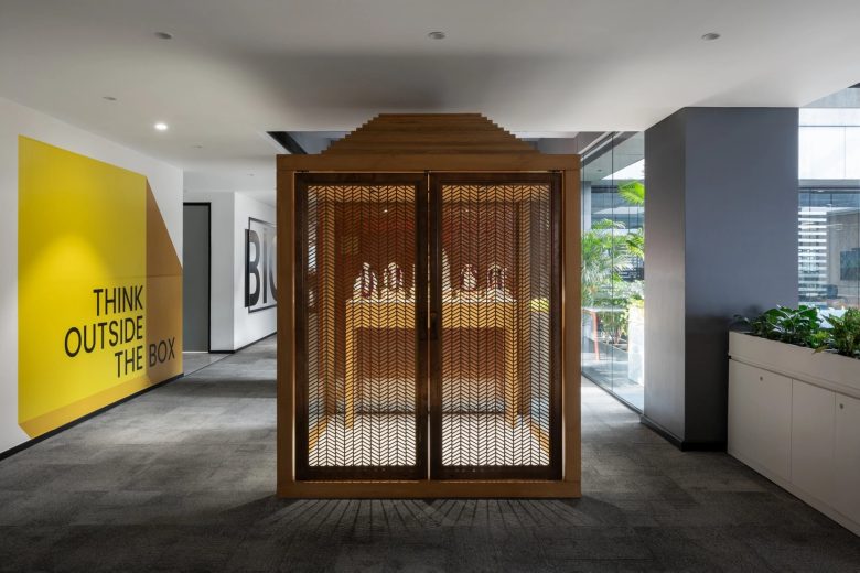 The corporate office is located on the top two floors of the South tower, with a separate entrance from the warehouse. The main office reception is a double-height space filled with soft sunlight from south-facing windows. Both floors open into this central area, connected by a sculptural staircase. The office accommodates 150 people and includes executive offices, HR, IT, and Accounting spaces. Facilities such as a cafeteria, recreation zone, café, town hall, showroom for Fybros products, boardroom, meeting rooms, director’s suite, and guest rooms are provided. A small standalone temple is built near the entrance of the upper floor.