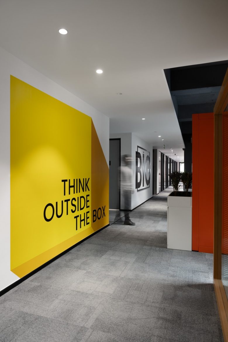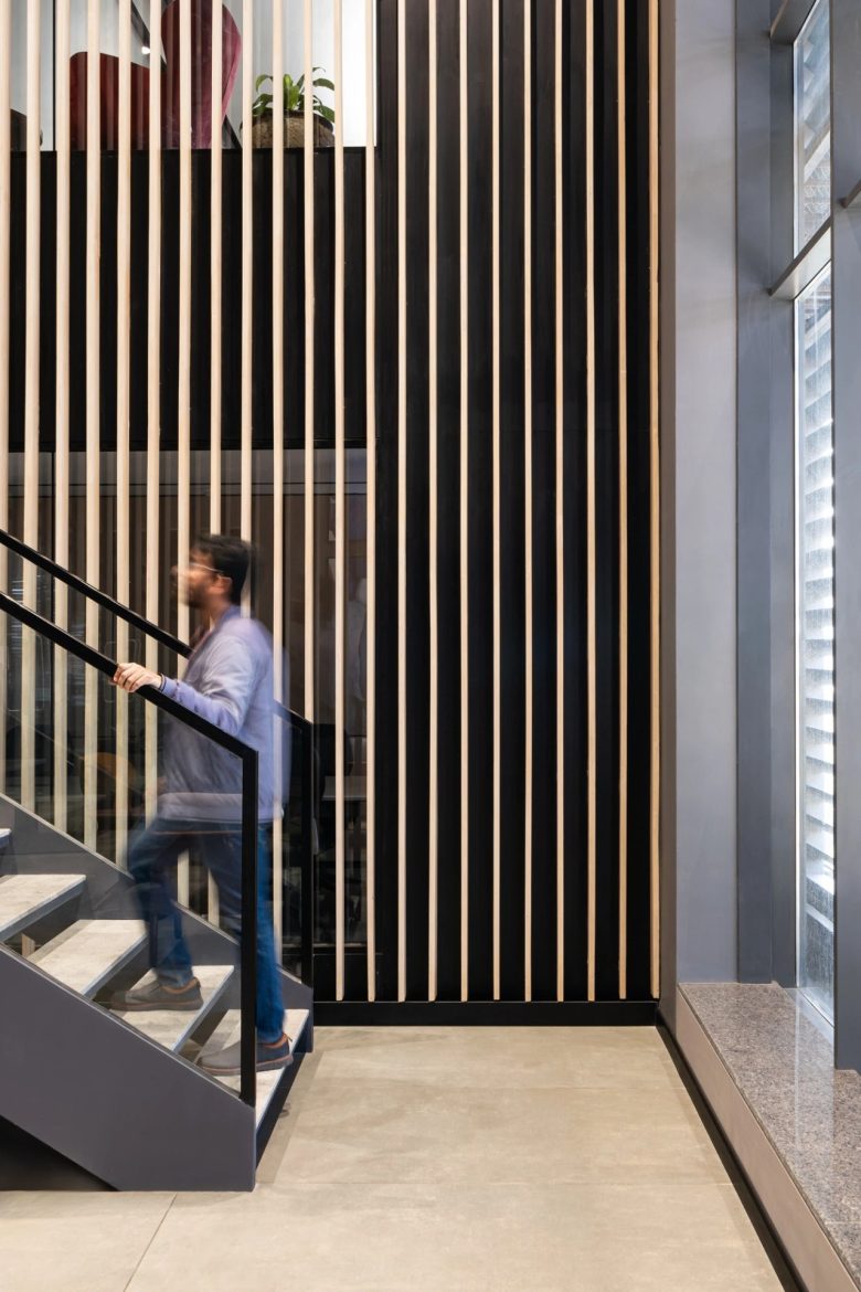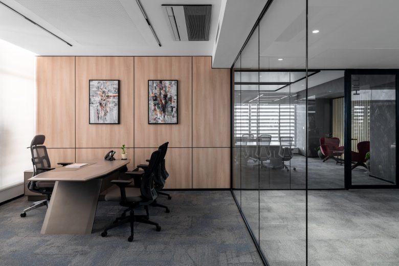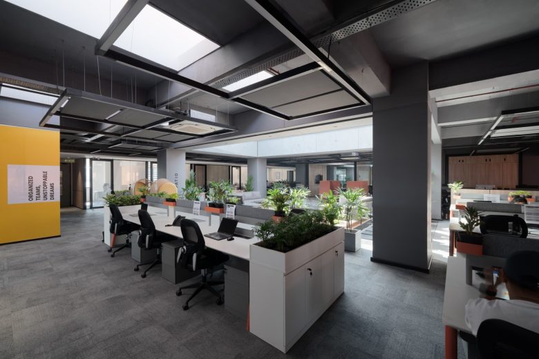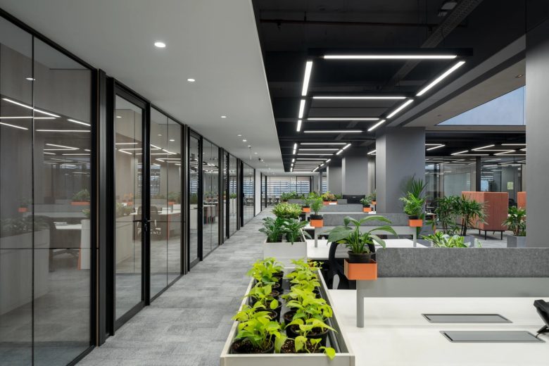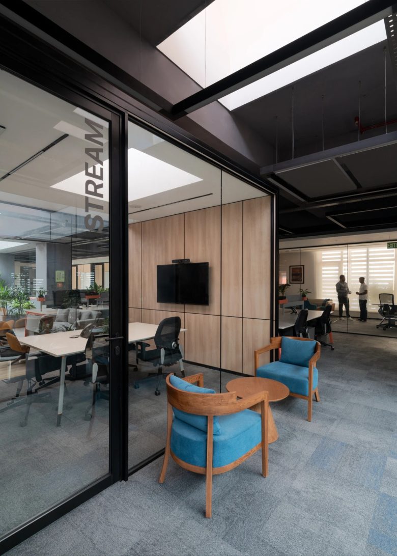 Natural light enters through louvered windows and large glazed openings. Glass partitions allow light to pass through the entire office, supporting a transparent work culture. Smart lighting systems and energy-efficient workspace designs reduce energy consumption. The material palette focuses on sustainable office interior design and user well-being. Grey carpeting, white walls, and exposed RCC ceilings create a neutral shell, highlighted by vibrant indoor plants and pops of colour. Smart technology features like motion sensors and automated climate control enhance efficiency.