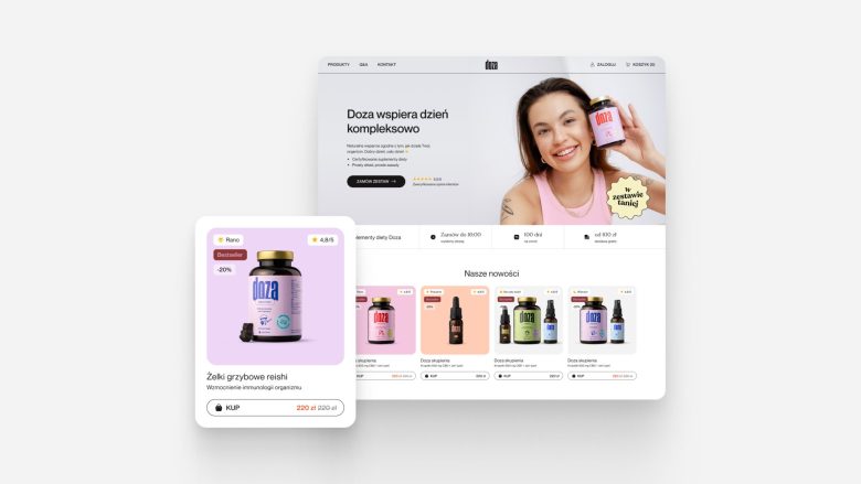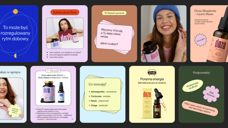 The name Doza refers to the idea of conscious, well-balanced body support — just the right amount to feel the difference. The brand builds its product naming system around simple, evocative phrases: Doza Relaksu (Dose of Relaxation), Doza Skupienia (Dose of Focus), Doza Energii (Dose of Energy) — each addressing a specific need of the body and mind.