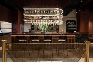 Lighting is integrated within the architecture to emphasize structure and warmth. A circular aquarium near the bar reinforces the project’s symbolic focus, introducing gentle movement into the interior.