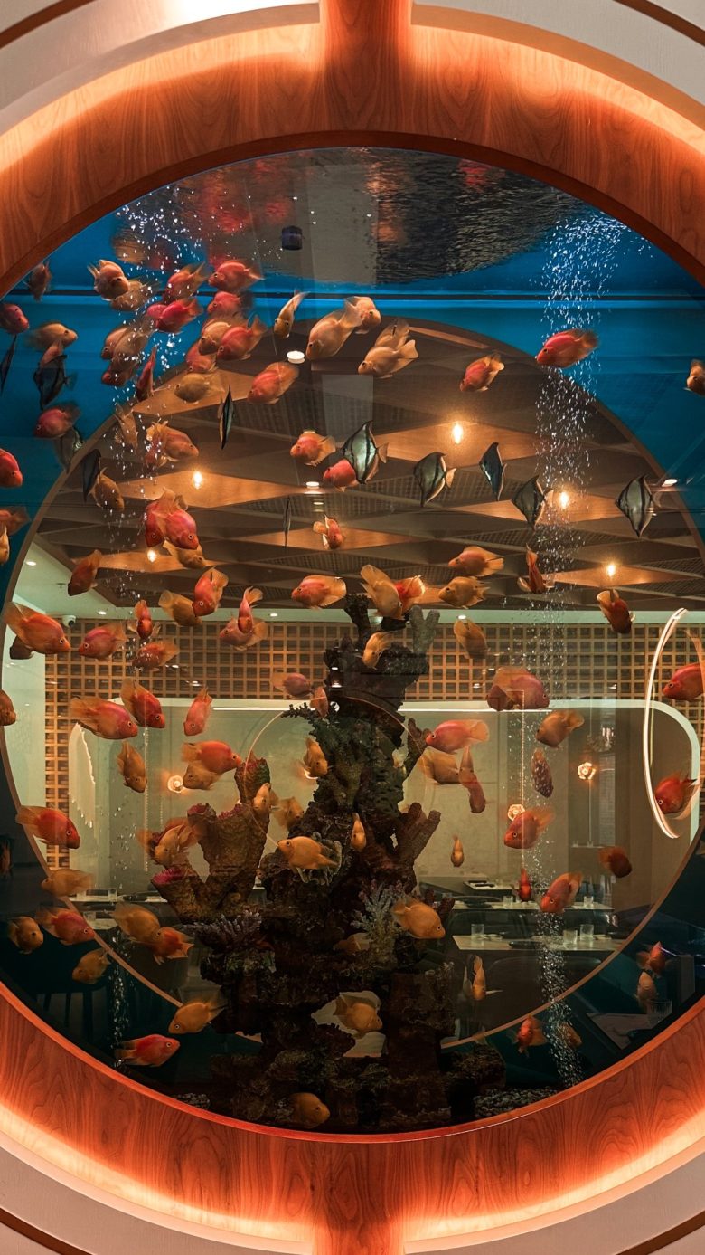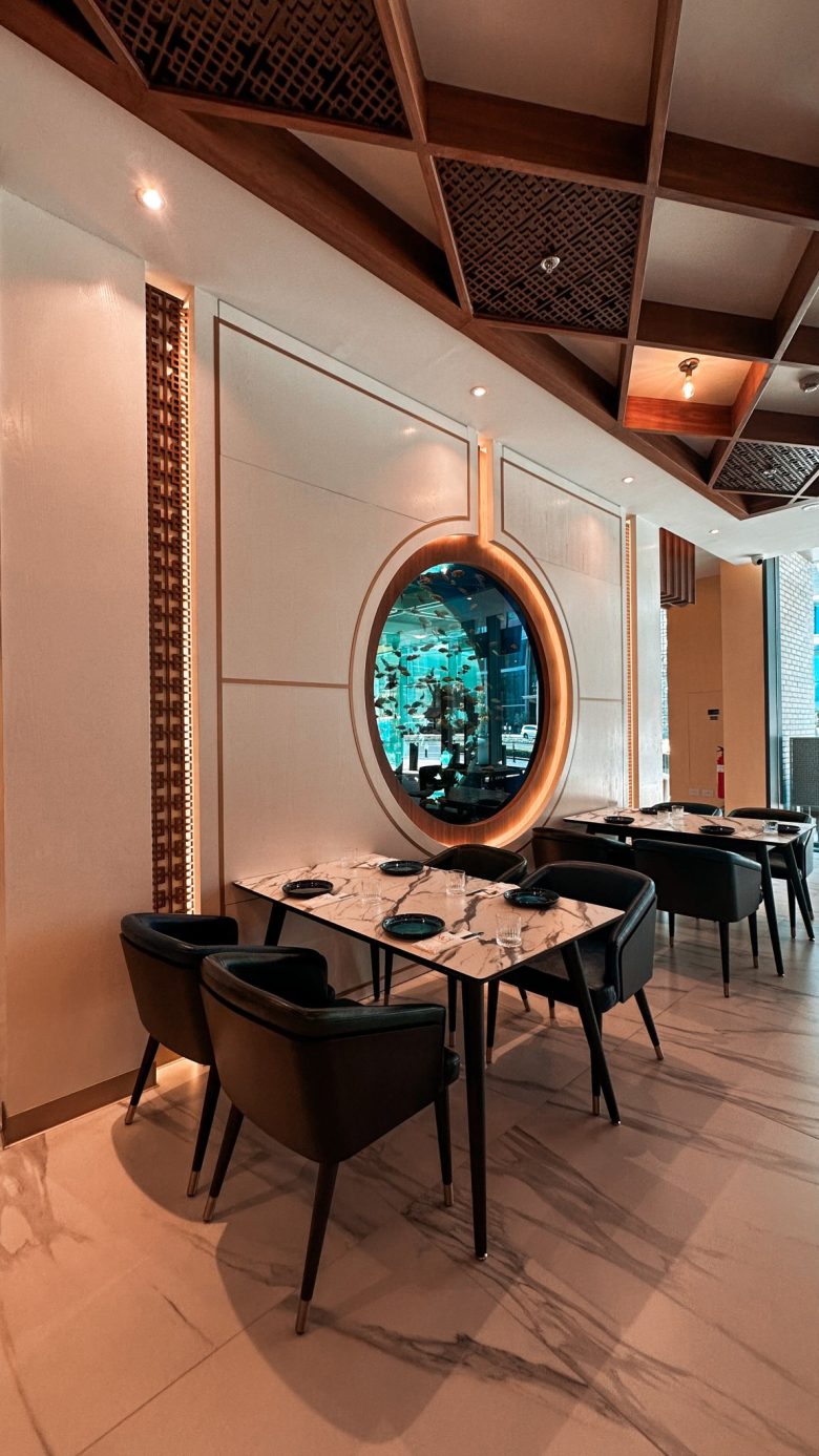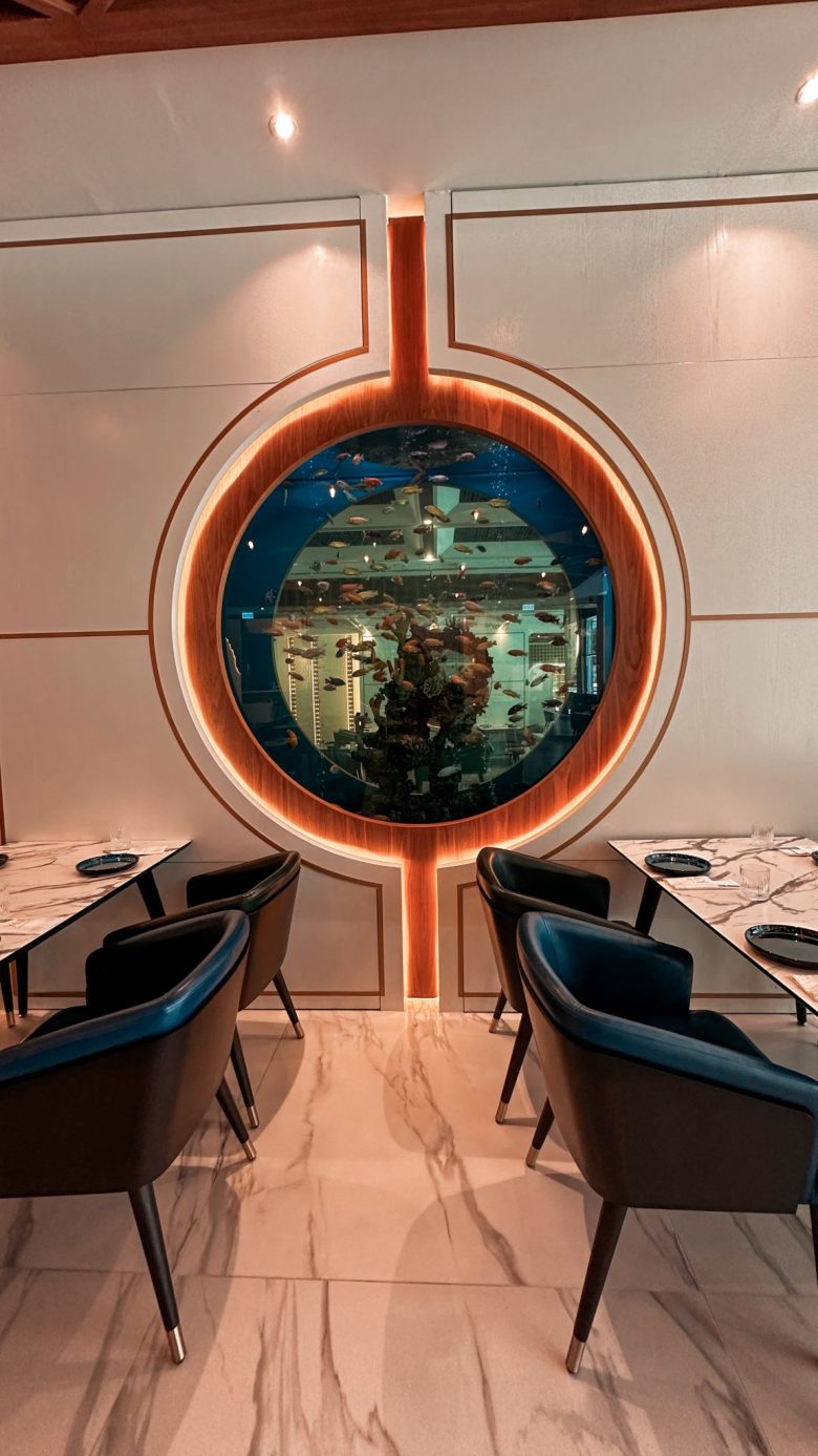 Lighting is integrated within the architecture to emphasize structure and warmth. A circular aquarium near the bar reinforces the project’s symbolic focus, introducing gentle movement into the interior.