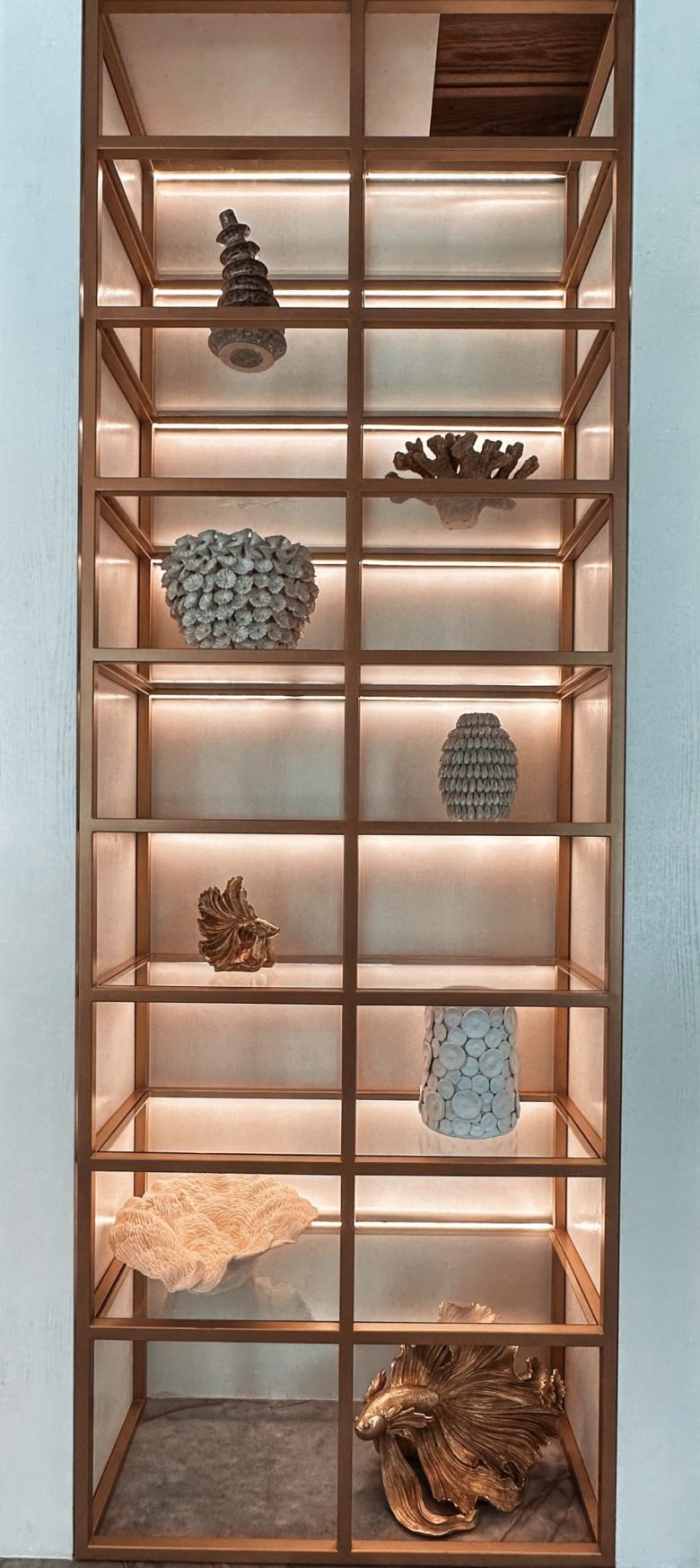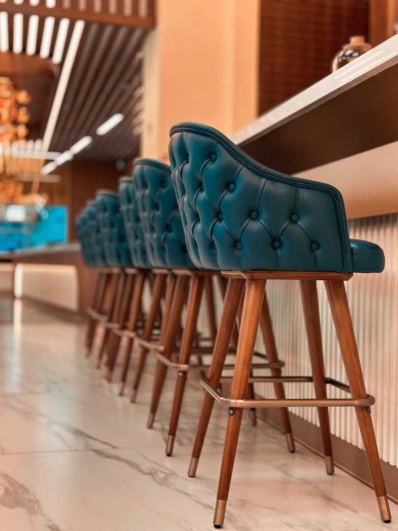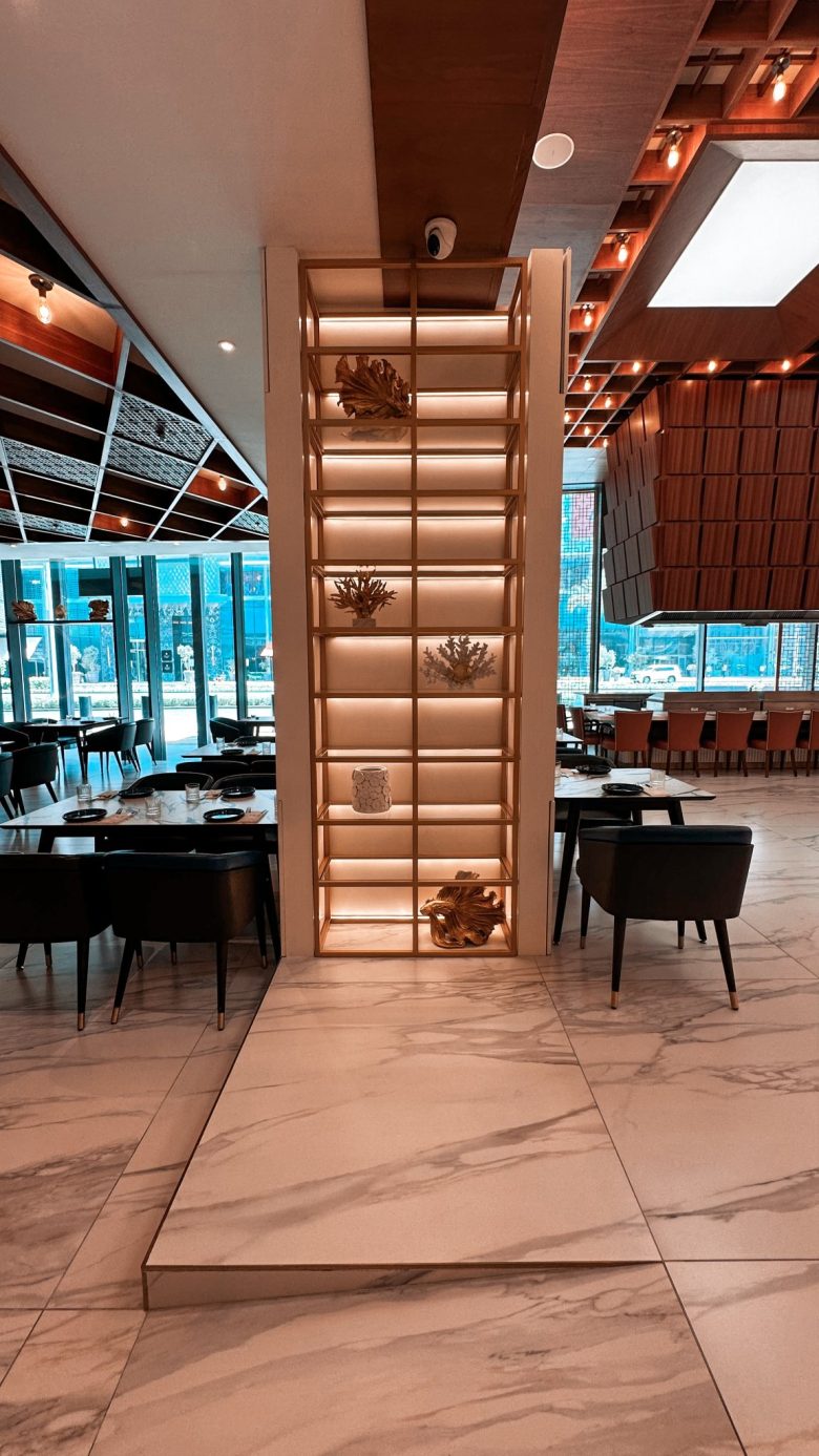 Lighting is integrated within the architecture to emphasize structure and warmth. A circular aquarium near the bar reinforces the project’s symbolic focus, introducing gentle movement into the interior.
