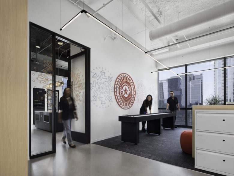 Collaborating closely with Gensler, BDO sought to create a workplace where its employees would thrive. The design prioritizes flexibility and well-being, providing a mix of open and enclosed areas that support both collaboration and independent work. Natural light and expansive city views define the interior, while social zones — including a central lounge with a shuffleboard table — encourage connection, offer moments of respite, and build a sense of community among staff. In tandem to these dynamic spaces, there are a number of private spaces for tasks that require a deeper focus.