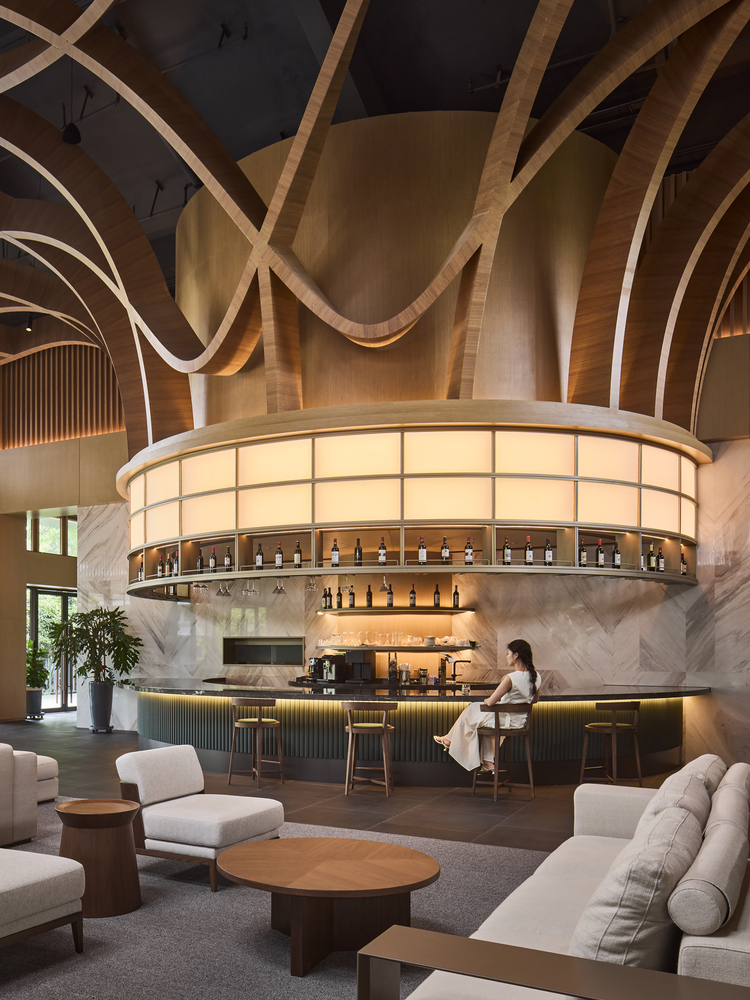 Positioned at the heart of the residential enclave and encircled by water and greenery, the clubhouse follows a design strategy of reconstructing order and light. Through the integrated renewal of architecture, interiors, and landscape, it becomes a unified setting for daily life. A restrained sloping roof defines the entrance, establishing a quiet ritual of return. Stone and timber lattice surfaces interweave, expressing the subtlety and reserve of traditional Eastern architecture.