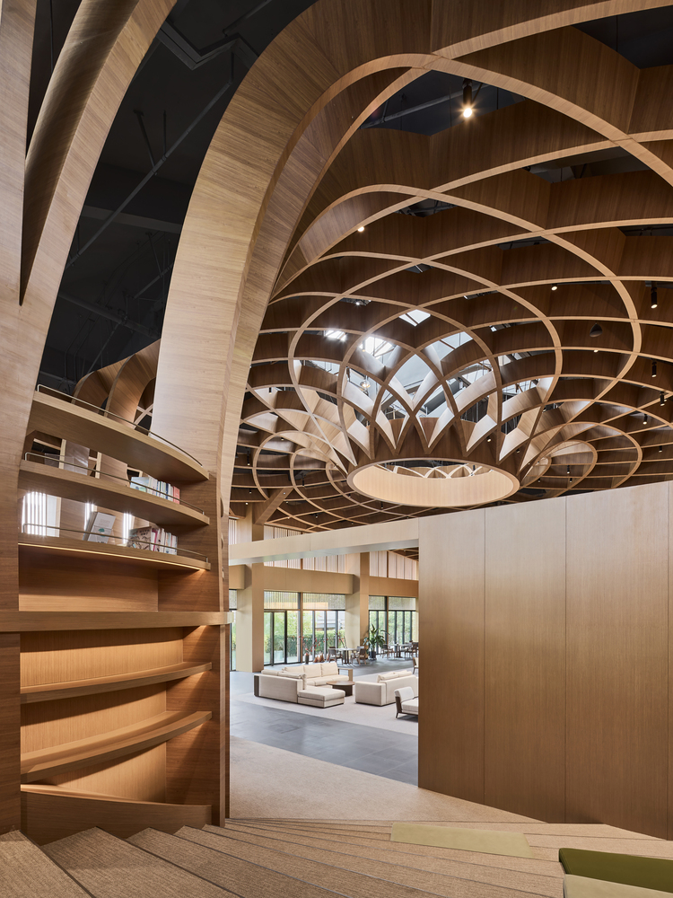 Parametric modeling and precision prefabrication ensure structural accuracy and light rhythm. The curved lattice extends downward, merging with a monolithic stone bar and a stepped reading zone, achieving a seamless dialogue between structure and function.