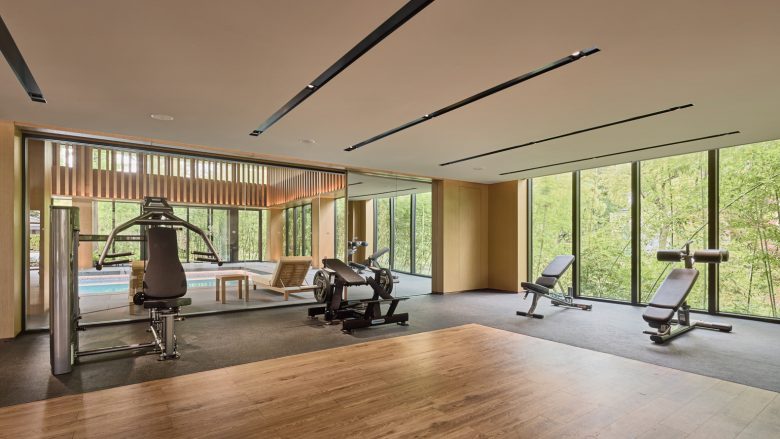 Beyond the central hall, deep overhangs and transparent façades connect indoor and outdoor scenes. The gym, swimming pool, all-day dining area, and private rooms maintain visual continuity with the surrounding greenery, balancing everyday use and resort-like relaxation.