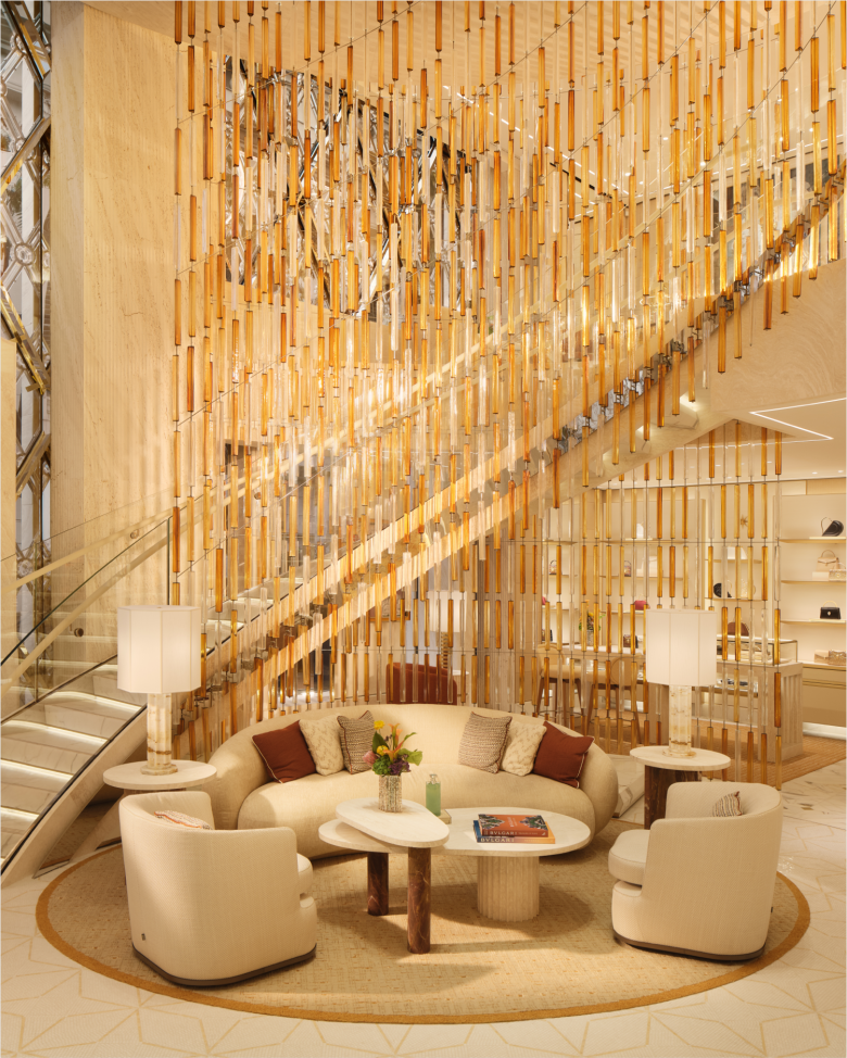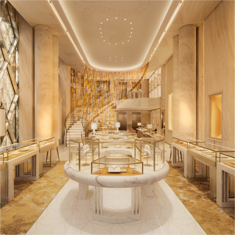 The elongated, lofty ground floor doesn’t shy away from palatial grandeur, featuring a backdrop of travertine columns, fluted walls and a ceiling adorned with a handmade gypsum Serpenti, a longtime icon of Bvlgari. Also part of the backdrop, at the far end of the retail space, is a grand staircase, decorated in golden tones that celebrate Bvlgari‘s heritage as a master jeweller, and paired with a delicate, floor-to-ceiling staircase curtain. Created by renowned Venetian glass design house Venini, the design takes cues from the radiant tones of sunsets in Rome and California sunsets, and comprises of no less than 1,400 handcrafted glass elements. Last but not least, there’s a Roman-style terrace, Bvlgari’s very first in all of North America. The renewed Bvlgari flagship store carries a curated selection of its High Jewellery and fine jewellery creations, spanning the brand’s most iconic collections, including Serpenti, Divas’ Dream, Tubogas, B.Zero1 and Octo watches. © superfuture