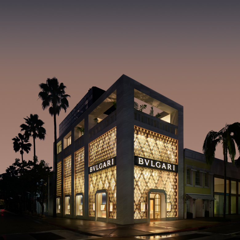Iconic jewellery house Bvlgari has just upped the ante in Beverly Hills by inaugurating a newly built flagship store. Situated on the area’s most prestigious shopping artery, the retail space measures 5,834 sq.ft. (542 sqm.) set across three-levels, oozing elegance, and unapologetically so, with a distinctly Roman touch. Entirely wrapped in handcrafted glass, which hints Bvlgari’s commitment to craftsmanship, the store looks like a fairytale jewellery box, as if to allude to the world of glamour, dreams and fantasy that’s so inherent to this part of town. The design also takes cues from the iconic Bvlgari store on Fifth Avenue in New York City , the design incorporate s a mesh motif drawn from the clasp of a heritage bracelet from the 1930s. The motif, known as the Rosetta, comes from the clasp of a heritage bracelet from the 1930s, and is delicately reproduced on the entire façade of the store.