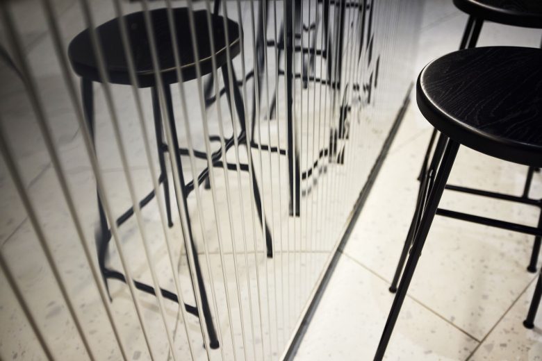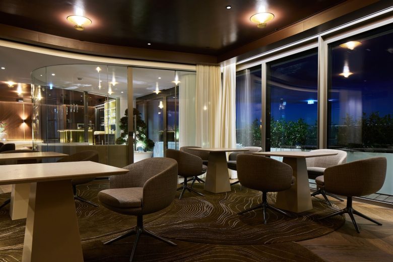 The Executive Lounge on the 32nd floor offers what is currently Vienna’s most exclusive view. Here, the atmosphere shifts to a warm, contemplative mood: dark oak, brass accents, golden mirror elements, and carpets specially designed by Labvert combine to create the character of a private club above the city rooftops. A sculpted bar, clad in golden mirror slats and subtly extended by a ripple-like pattern, fuses ornament with form. A curved, glass-enclosed patio completes the composition, providing an intimate architectural gesture that gently blurs the boundary between interior and skyline.