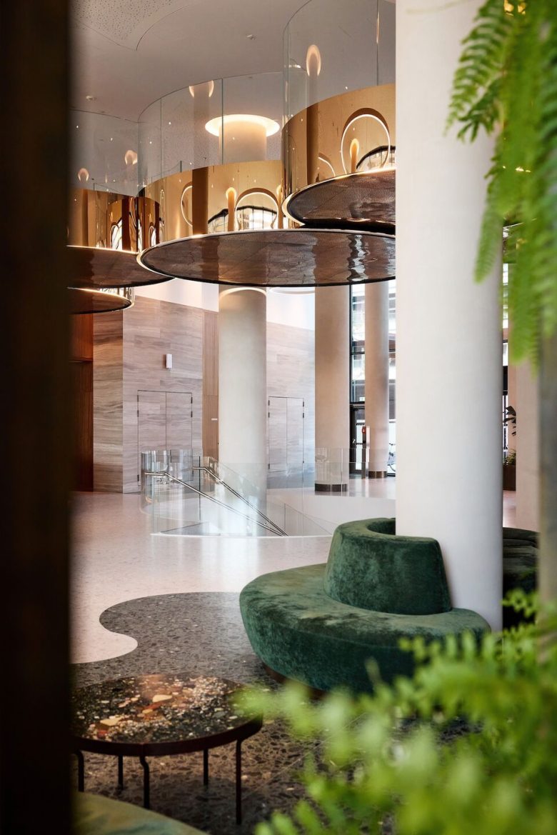 Dive into another world: In the expansive lobby, the aquatic narrative comes to life through oversized rings of light suspended overhead evoking droplets falling onto a water surface. The circular motif continues in a sculptural mezzanine designed as a free-floating landing stage. With its reflective tombac-metal underside, this intermediary level becomes both a captivating focal point and a bold architectural statement.