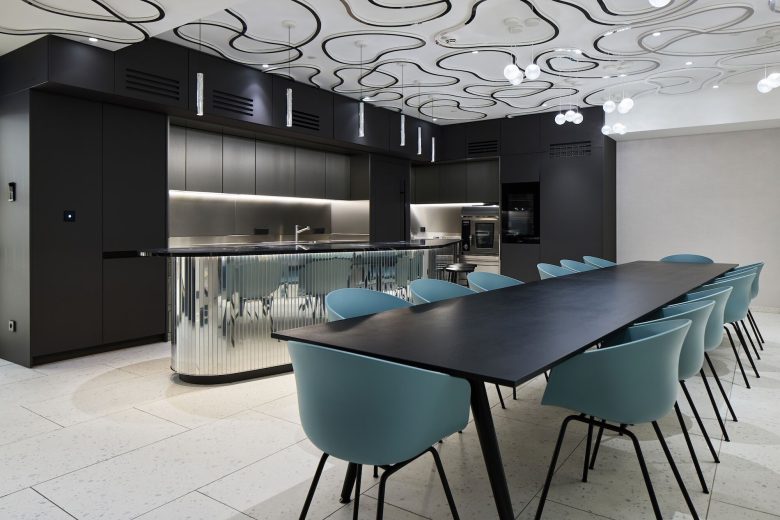 On the 12th floor, the Event Lounge continues the aquatic motif through a palette of cool blues and soft grays. Above the fully equipped cook-and-chill area, the ceiling features an array of irregular mirrors that resemble sunlight dancing on water, adding depth and rhythm while animating the space with ever-changing reflections.