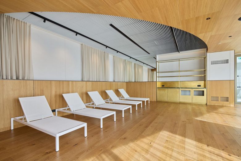 The club’s curved layout—accentuated by floor-to-ceiling windows and sliding glass doors—frames breath taking panoramic views of the surrounding urban landscape. Material choices such as oak flooring, green marble, and reflective copper accents reinforce the organic theme while enhancing the club’s sensory richness. An integrated business lounge provides a quieter area for work and meetings.