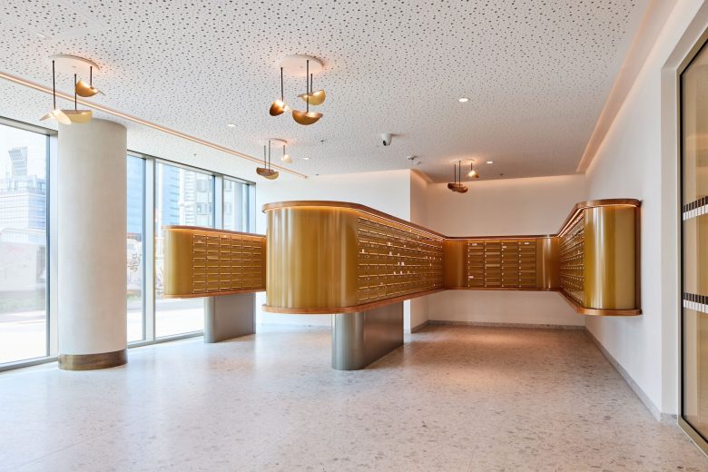 Gentle curves extend to the concierge desk and the inviting waiting area, where sinuous emerald-green sofas merge with the floor tiles, creating a playful illusion of islands emerging from water. This fluid spatial language continues to the mailroom, where rounded furnishing and custom-made lamps evoke the delicate motion of birds in flight.
