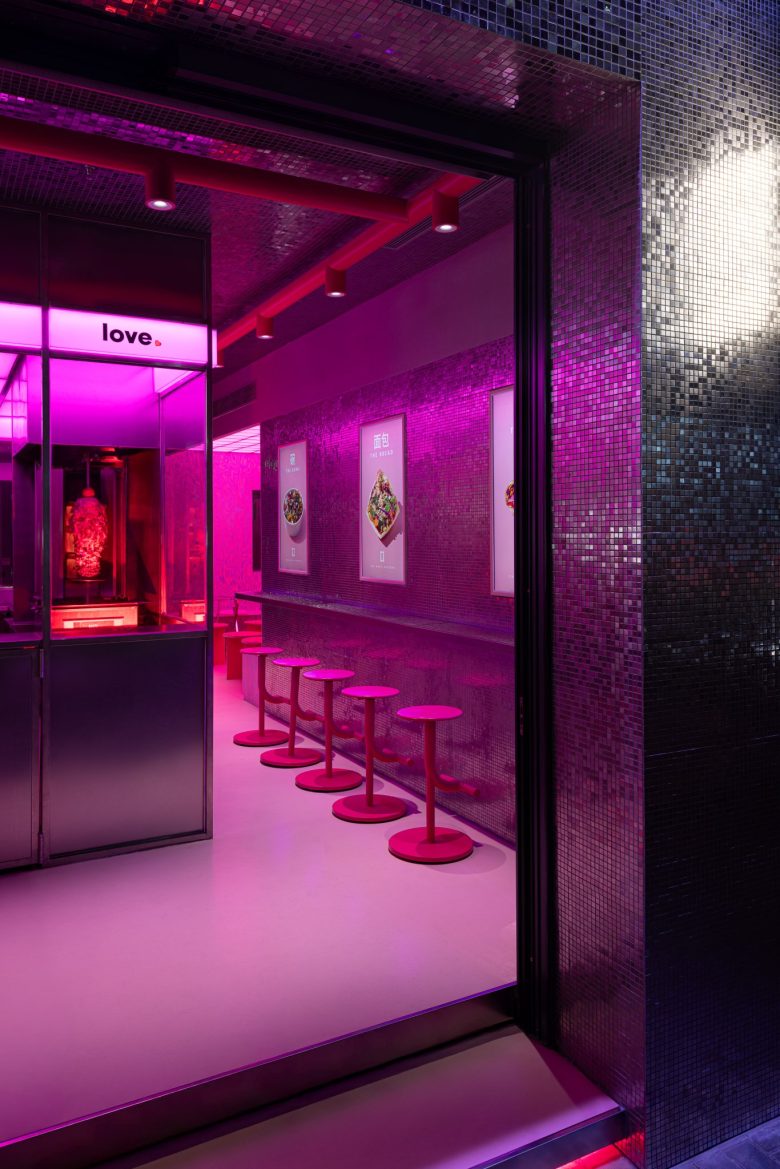 The spatial sequence reflects two rhythms—efficient and playful. At the entrance, the open counter and visible kitchen merge street immediacy with a sense of arrival. A mirrored kitchen box at the center introduces calm precision, suggesting that street food can have a refined core. Toward the back, softer lighting and relaxed seating form a zone for lingering, gathering, or late-night DJ use.