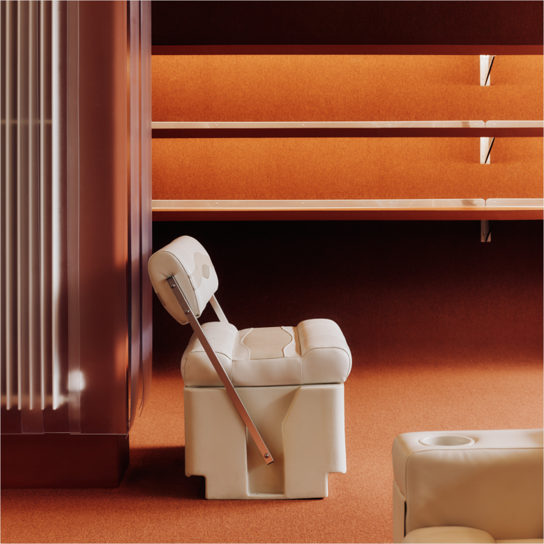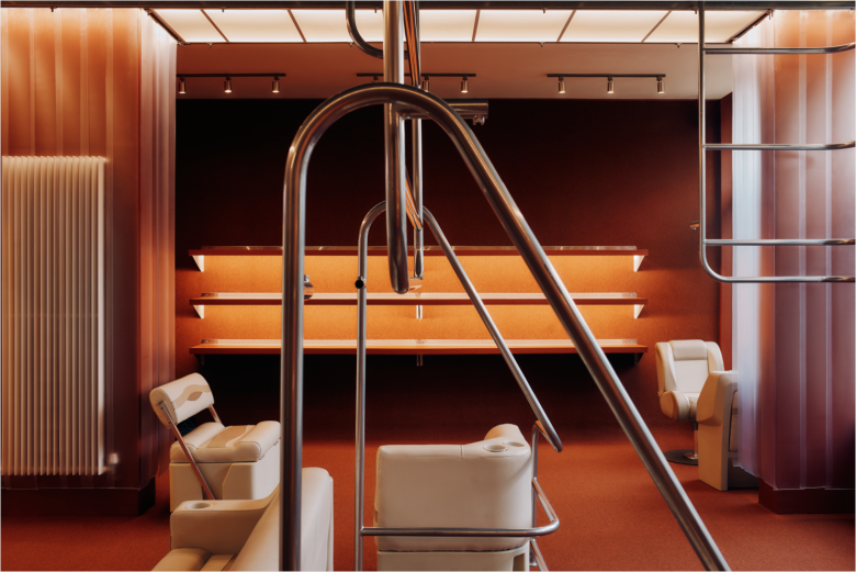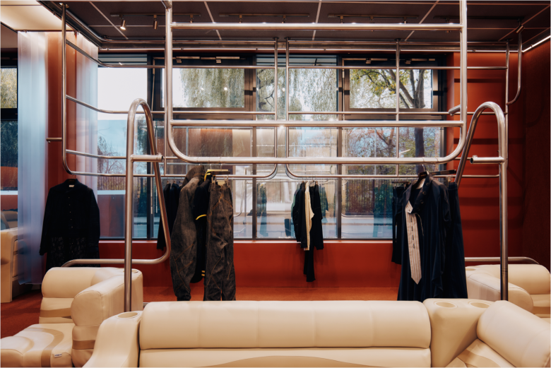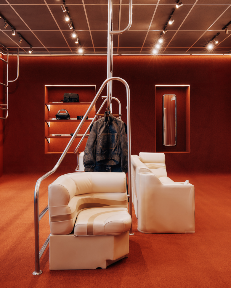 The installation, entitled Stunt Tank, has been revisited and thoughtfully reimagined, seeing its physical components becoming the primary furniture of the store itself. As such, the design extends an ongoing dialogue between the artist and the brand’s highly experimental spatial focus. Obviously, the original design needed to be translated into a commercial space while also preserving its spirit, deconstructing and repurposing its core physical components, such as pontoon boat railings, cream leather boat seating and ceiling tiles. The design centres on bold material inversions and extensions—chrome pontoon railings were flipped upside down and mounted to the ceiling, serving as clothing rails, and boat seating from the installation is now distributed throughout the store, with only one piece repurposed as seating in the fitting room. Additionally, the original brown carpet was interpreted in a deep maroon and extended up the walls.