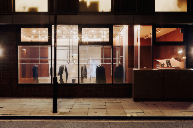 The walls were then excavated to create recessed, built-in shelving, seamlessly integrating display functions into an immersive monochromatic environment. Long softly backlit PVC curtains that cascade to the floor from each side of an illuminated ceiling, partially obscuring the structural columns and creating a dramatically lit threshold into the artwork. Old catering shelves have been repurposed and covered in marmoleum to create a long display to showcase the merchandise. As said, the Kiko Kostadinov design studios are situated right above, and this uncommon pairing of the two spaces further dissolves the barrier between the public-facing shop and the brand’s internal world. Designers and staff pass through shared spaces. The store layout is versatile, adapting easily to a variety of in-store events. The new Kiko Kostadinov store carries men’s and women’s apparel, accessories, bags, shoes, footwear, and special projects items. © superfuture