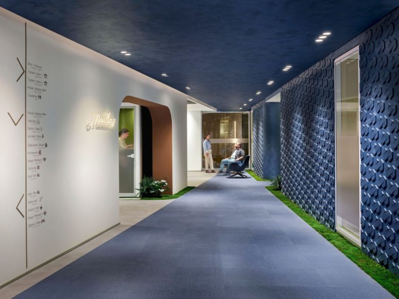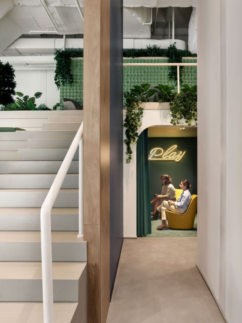 Thirdly, we used many greens and plants throughout the office to have a biophilic design.