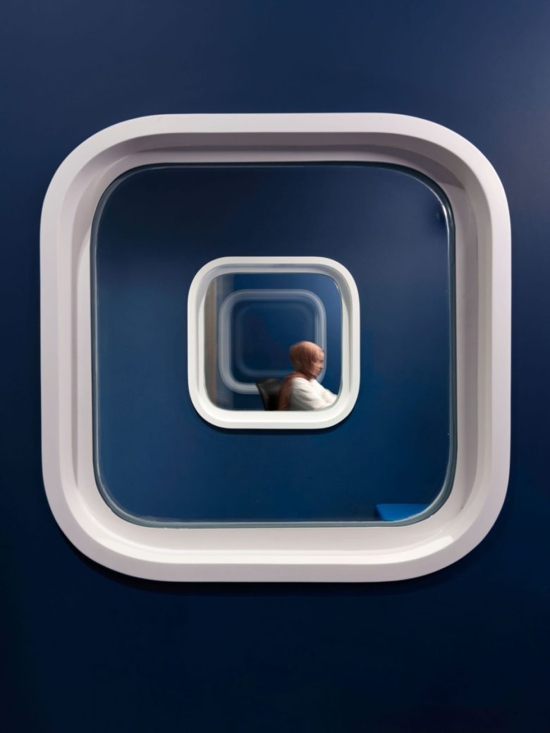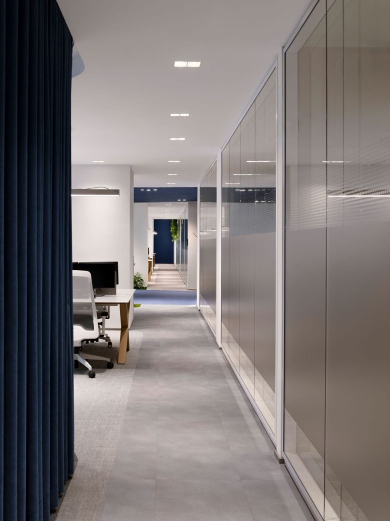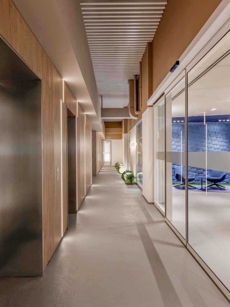 After the entrance hall, area is split into two by a blue corridor which resembles Istanbul bosphorus. This line then opens up to an office gallery with high ceiling and mezzanine and then connects to a sculpture like staircase which also follow the lines of the bosphorus.