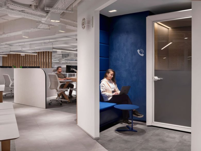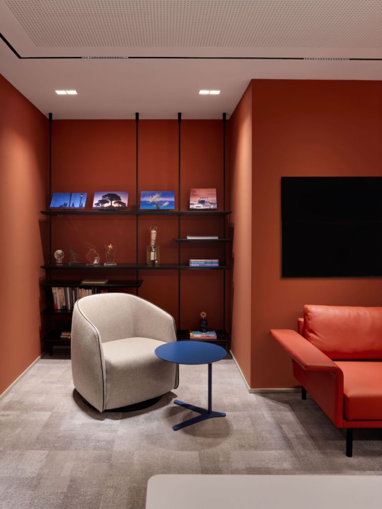 As this is a very crowded office space as well as using many acoustic elements to reduce noise pollution, we created many spaces for the employees to relax for a while or to change their working mood if they wanted to or to have a private work session or meeting just close by without any reservations needed. In this office you don’t have be on your desk, you can work anywhere.