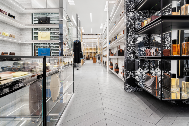The upper retail segment in Vienna continues to expand at an accelerated, and following the opening of boutiques by Van Cleef & Arpels, Dior and LOEWE, the latest luxury fashion house to arrive here is CELINE. Occupying a three-storey unit on the premises of a listed landmark building, the retail space features the lavish interior design codes as initially laid down by its previous creative director Hedi Slimane. In contrast with the historic ornate façade, the settings inside features a backdrop of the finest natural stones and materials, such as Grand Antique marble, paired with travertine stone, and Basaltina floors, which are laid all over, and are adorned with a chevron-patterned motif. Additionally, extra-clear mirrors, some tainted in antique gold, neon lights, and polished metal heighten the grandeur even further. Here, CELINE‘s women’s apparel, accessories, and leather goods by current creative director Michael Rider can be found, in addition to beauté & haute parfumerie merchandise.