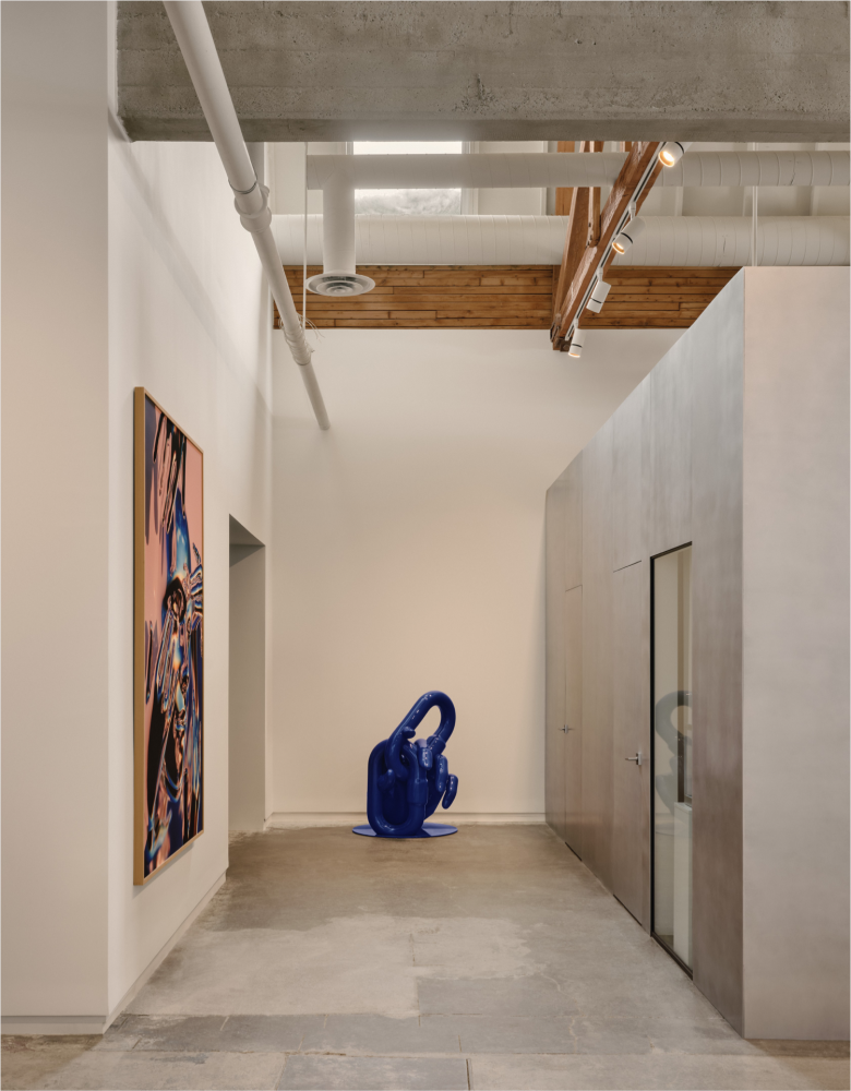 New skylights brought in natural light, creating an entirely new spatial experience, while an abstract metal volume was inserted at the core of the space, organising the gallery’s public areas and housing its private functions. The outer walls are dipped in a white hue, providing exhibition surfaces and a sharp contrast with the preserved textures of the floor and ceiling. The design approach taken not only demonstrates a clever reuse of heritage buildings in today’s urban development, but also a sustainable transformation of former industrial venues. Upon entering Foil Gallery, visitors find a café, featuring a sleek curved counter with an artisanal micro-cement finish and paired with custom-made steel stools by Canadian designer David Raymond. At the back of the space, a closed projection room is situated which is used for audiovisual works and immersive events. The aformentioned metal volume also houses a meeting room and workspace, furnished with a large table by local woodworker Essai and Vipp chairs. © superfuture