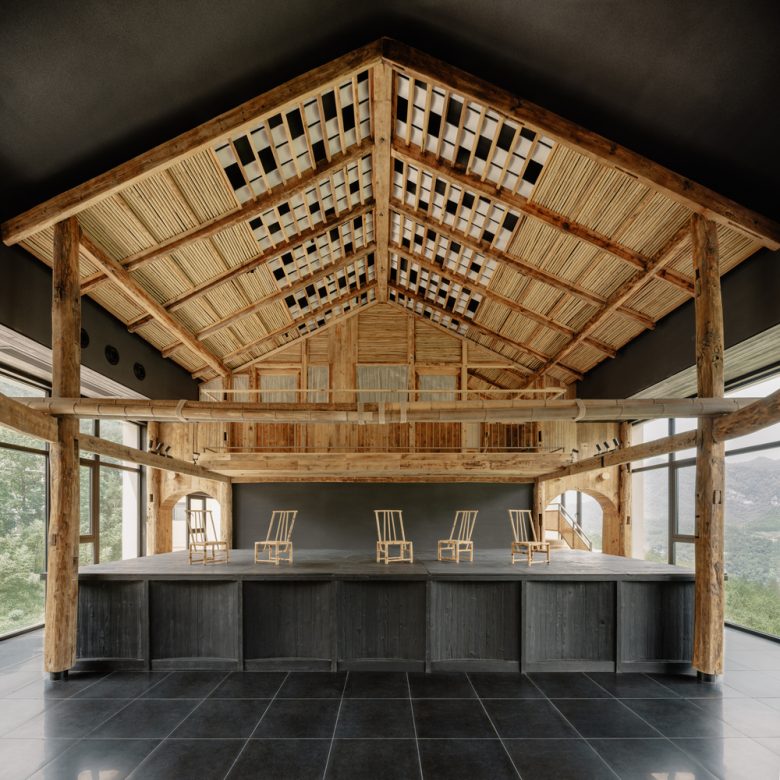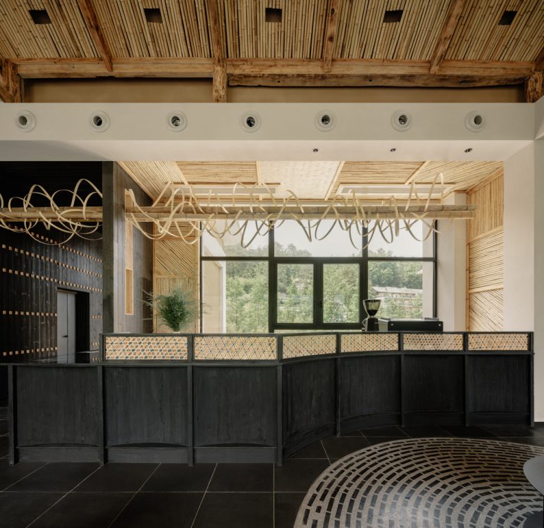 Entering from the top level, visitors arrive at the reception floor where functions unfold along the building’s linear plan—lobby, lounge bar, multifunctional stage, and mezzanine offices—all facing panoramic mountain views. Interior finishes use locally collected bamboo shoot shells, reclaimed timber, carbonized wood, woven bamboo artworks, and black stones to create a tactile, immersive environment crafted in collaboration with local artisans.