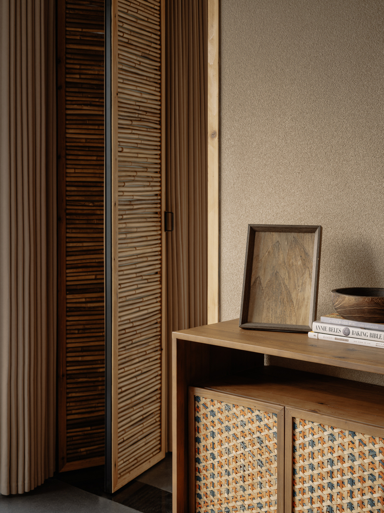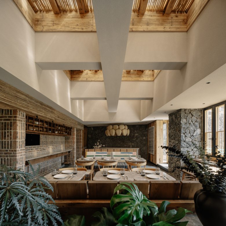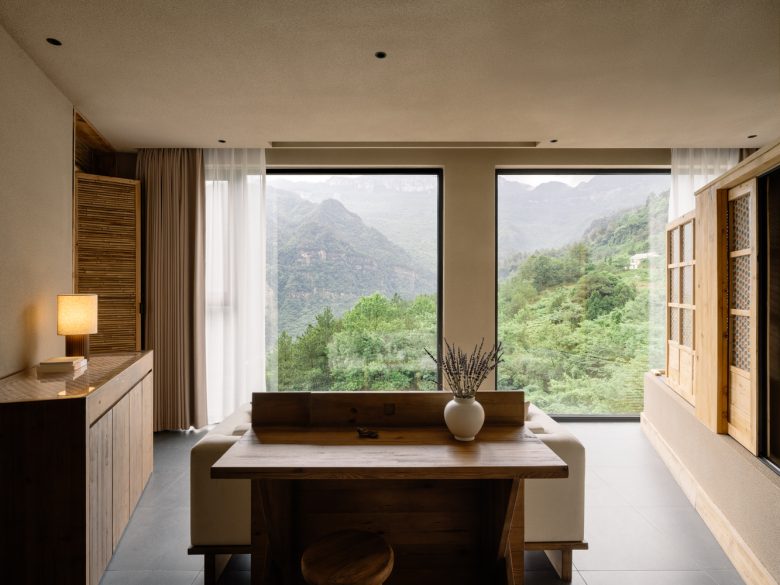 Twenty-five rooms are arranged in a fan-shaped plan oriented toward the mountain, including courtyard suites, high-floor rooms, and standard units. Earth-toned palettes connect natural materials, structural frames, and crafted details, extending the hotel’s design language into private spaces that feel calm, grounded, and connected to nature.