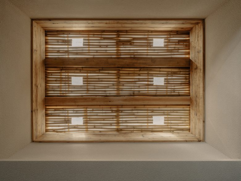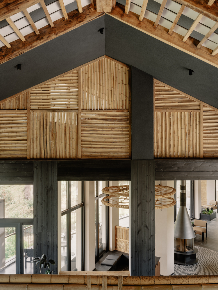 Retaining the existing structural frame, the renovation reinterprets the local “frame-and-infill” logic to reorganize the façade and internal flow. Eight vertical white structural columns accentuate the rhythm of the slope, while locally sourced bamboo panels and dragon-scale stones establish a horizontal dialogue with the terrain. The top balcony extends the building’s timber framework outward to form a semi-open bamboo canopy that blurs boundaries between interior and exterior.