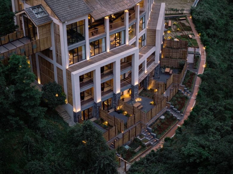 Cloudhaus Hotel is located 1,200 meters above sea level on the northern slope of Jinfo Mountain in Nanchuan District, Chongqing, China. Originally built as a sales office for a resort development, the five-level concrete structure has been sustainably transformed into a 24-room boutique hotel that reflects the mountain’s natural character and local craftsmanship.