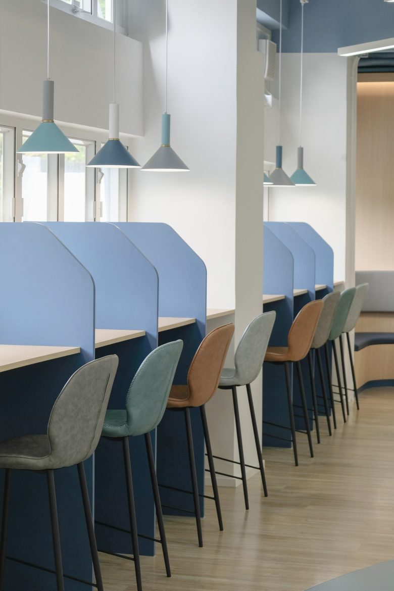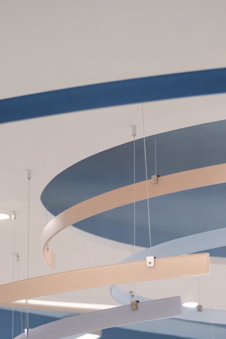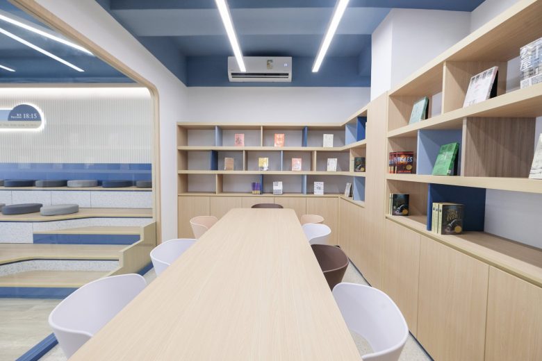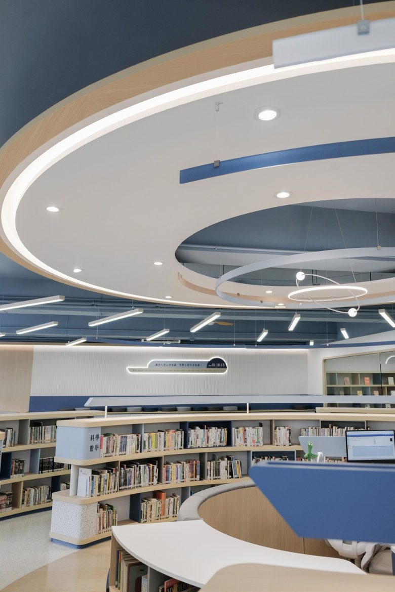 The library’s core design concept is “Light of Knowledge.” A beam of light converges from the ceiling at the central point, forming a rounded and warm light column that projects downwards onto the circular service desk, then spreads outwards like ripples, defining different functional zones in layers. This light is not merely a visual focal point; it symbolizes the transmission of truth and the inspiration of wisdom, guiding students to explore, think, and grow along its trajectory.