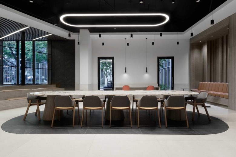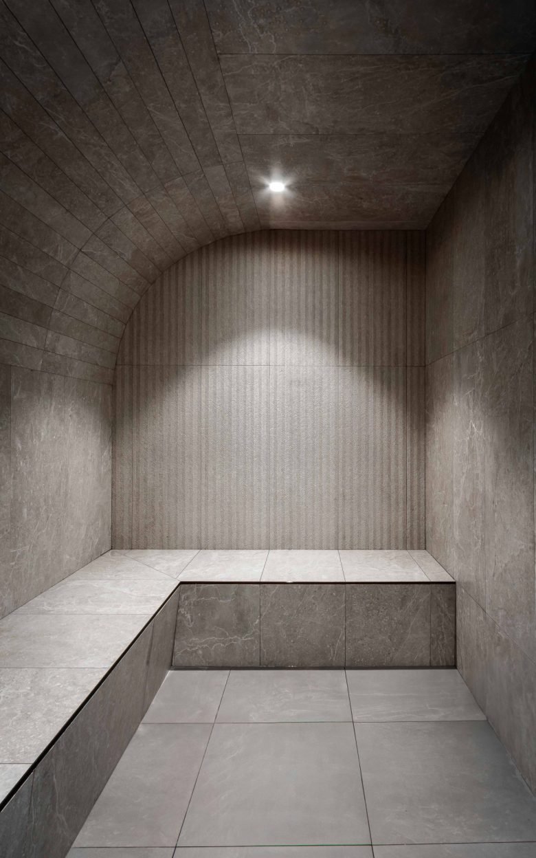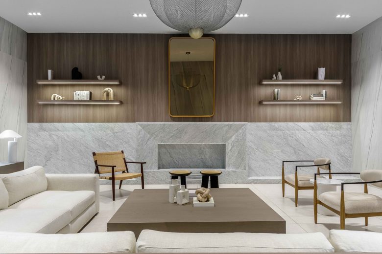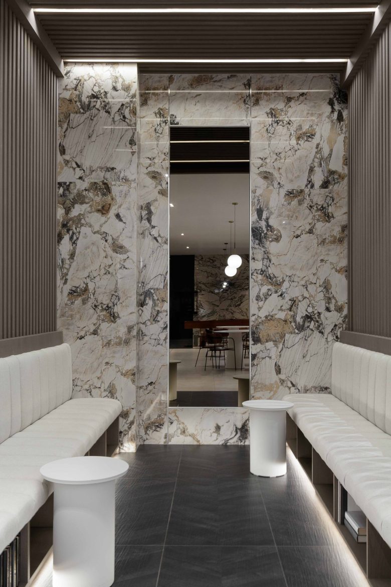 resident lounge, and co-working space. The design is defined by a sophisticated dialogue between materials, establishing a