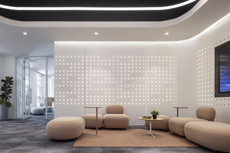 Amdocs’ technological evolution—from early punch cards to contemporary software and AI—served as a visual narrative. A perforated “dot” motif inspired by punch cards appears in backlit LED panels at the entrance, transforming the lobby into an interactive display for community events. The motif continues in locker ventilation, glass film patterns, and lighting details. Curved walls and an irregular linear lighting fixture enhance movement and create fluid circulation throughout the space.