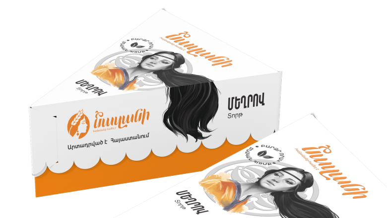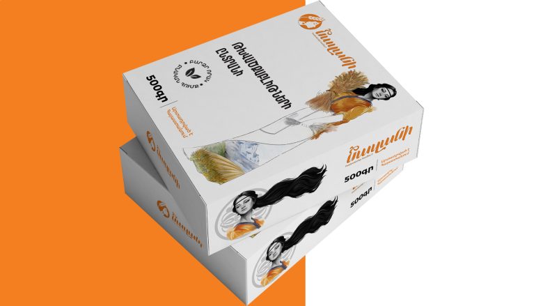 The character illustration combines pencil-style portraiture with warm, expressive brushstrokes in orange tones, echoing the brand’s primary color and the richness of Armenian fields. This fusion of monochrome and color creates a dynamic focal point while preserving an artisanal feel.