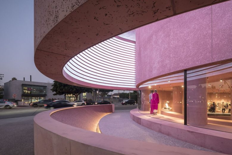 The Webster’s latest flagship store in Los Angeles is a new 11,000 square feet ground-up retail development adjacent to the historic Los Angeles Beverly Center. Juxtaposed beneath the monolithic eight story structure, The Webster elegantly asserts itself as a sculptural and experiential counterpoint to the Beverly Center’s retail experience. The cantilevered concrete facade references and reimagines the brutalist shell of the original existing building and is injected with a pink dye—an ode to the luminosity of California, where the Pacific light naturally amplifies saturated colors.