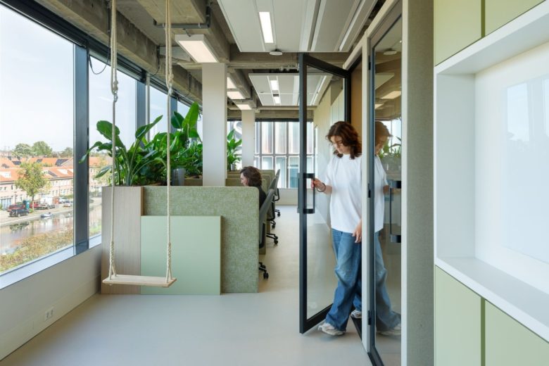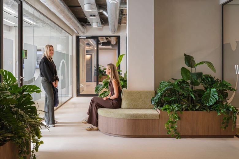 The design is inspired by Landal’s holiday parks and translates the feeling of being surrounded by nature into a modern office setting. Biophilic design principles guided the use of natural materials, earthy tones, and abundant greenery to create a calming atmosphere. Hospitality elements ensure a welcoming feel, while branding is subtly woven throughout the interior.