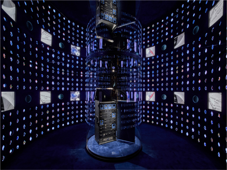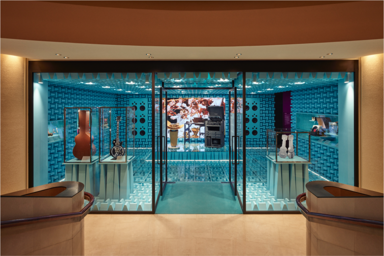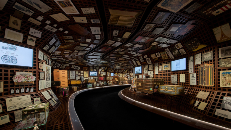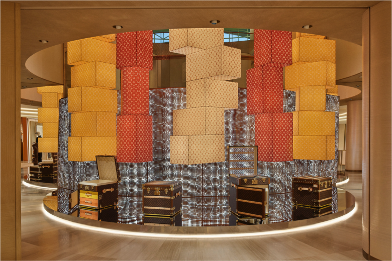 The Monogram room offers a comprehensive overview of the iconic canvas, beginning with an entrance that traces its origins of since 1896. The main space presents a playful array of forms as templates cut out from a floor-to-ceiling Monogram wall. Descending the staircase from the fifth to the fourth floor, visitors witness an Atrium where monumental trunk columns composed of Monogram hanji paper are lit from within, creating luminous lanterns suspended from the ceiling. The Music room unfolds in greater depth in an anechoic-like chamber where custom instrument cases, portable speakers, and DJ boxes are artfully juxtaposed with everyday objects like an iPod cover. The Collaboration and Fashion rooms are back-to-back rooms that benefit from ever-changing backdrops that convey the diverse creative output and infinite possibilities through the distinct visions of creative directors and artists who collaborated with the House.