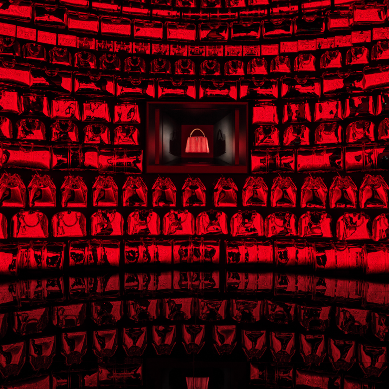 Artifacts and ready-to-wear are displayed, spanning historical collaborations with designs from Marc Jacobs, Kim Jones and Virgil Abloh along with creations of Nicolas Ghesquière and Pharrell Williams, with emphasis on travel and the House’s connection to South Korea. For the Collaboration room, the bags rotate on a carousel as their canvas are projected onto a screen, the image mirrored across a wall of reflective bags creates a fully immersive experience. The Fashion room playfully employs a split-flap display (as used in airports and train stations) exploring the evolution of Louis Vuitton’s collections and fashion shows. Links to South Korea can be found in both rooms through for instance the Artycapucines bag designed in collaboration with artist Park Seo-Bo or Look 1 from the Women’s Pre-Fall 2023 Show staged on Jamsugyo Bridge in Seoul. © superfuture