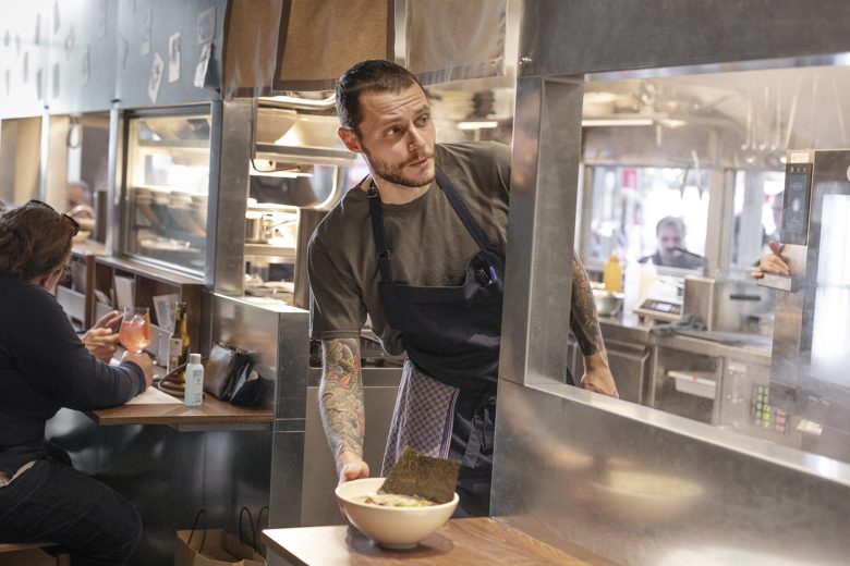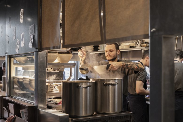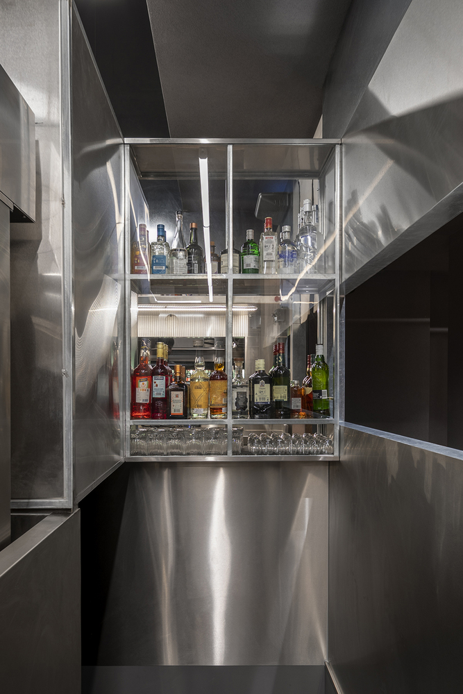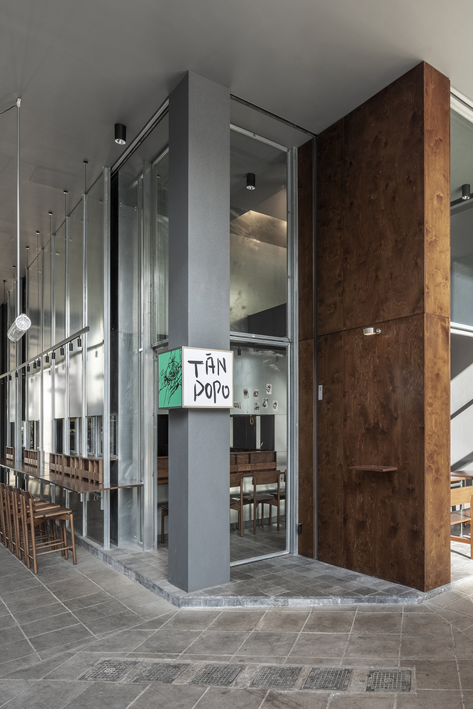 The design intention of TRAIL [practice] was to blur the boundaries between public and private, bringing the action (of cooking) into continuous interaction with passersby. Spatially, this translated to positioning the food preparation area at the forefront of the street view and at the core of visitors’ flow moving from inside to outside and vice versa. The open kitchen is integrated into a freestanding metal geometric frame with double height, structurally independent, and potentially movable. In this way, the kitchen operation resembles that of an independent universe with its own rhythm and rules. The unobstructed visibility of all food preparation processes enhances the sense of immediacy while conveying the kitchen’s pulse to the visitors. Meeting points of interaction between the two worlds, of preparation and consumption, are the food counters where the chef serves the ramen directly to the customers.