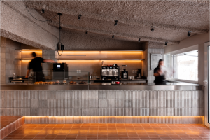 The first “pavilion” is related to the site, while the second “pavilion” focuses on the interaction between the barista and the customer. Within the “pavilion,” the space under the eaves is divided into two parts by an enclosing bar counter: one part belongs to the barista, and the other part belongs to the customer. The centrally located oval bar counter is the barista’s domain, which can be understood as the barista’s performance “stage.” It allows the barista to both prepare and serve coffee while maintaining an adequate sense of enclosure and enough space for interaction with the customer. Outside the bar counter, the space between the eaves and the four columns beneath them is reserved for the customer. This area offers both a sense of belonging to the pavilion and the experience of sitting around and watching the “stage” at the center.
