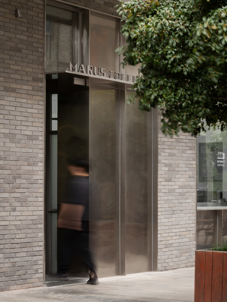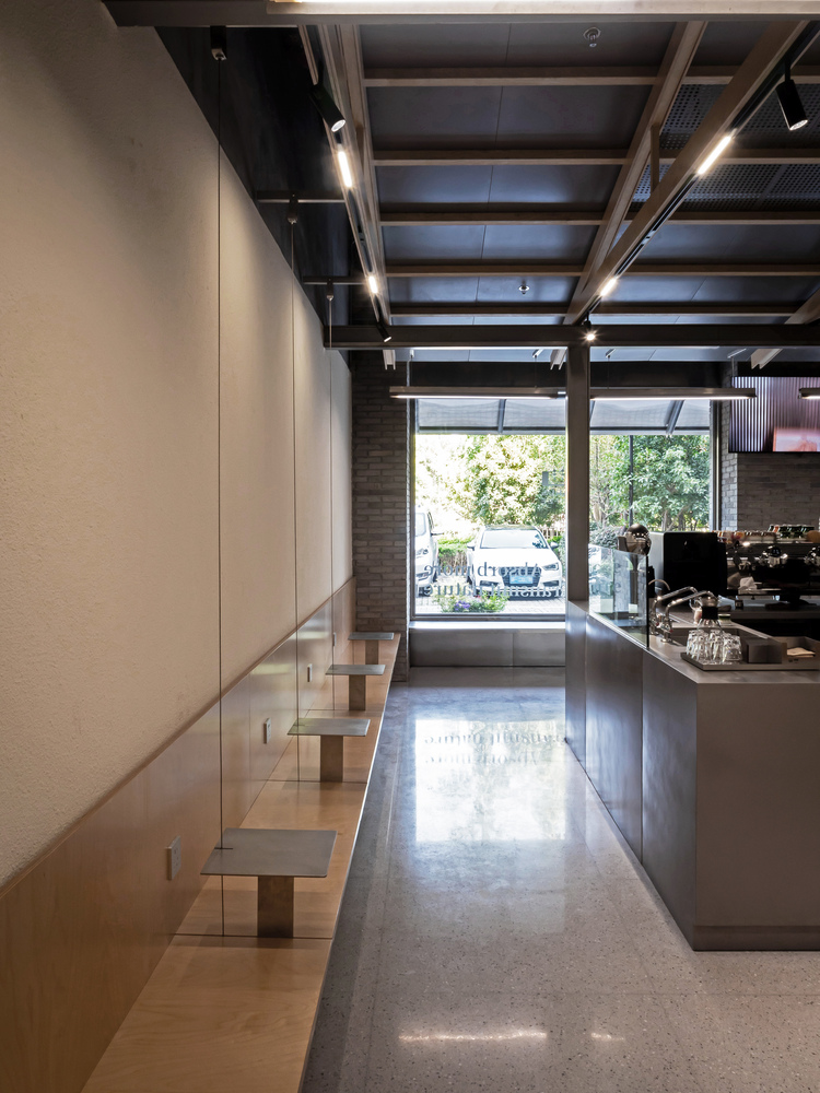 The first “pavilion” is related to the site, while the second “pavilion” focuses on the interaction between the barista and the customer. Within the “pavilion,” the space under the eaves is divided into two parts by an enclosing bar counter: one part belongs to the barista, and the other part belongs to the customer. The centrally located oval bar counter is the barista’s domain, which can be understood as the barista’s performance “stage.” It allows the barista to both prepare and serve coffee while maintaining an adequate sense of enclosure and enough space for interaction with the customer. Outside the bar counter, the space between the eaves and the four columns beneath them is reserved for the customer. This area offers both a sense of belonging to the pavilion and the experience of sitting around and watching the “stage” at the center.