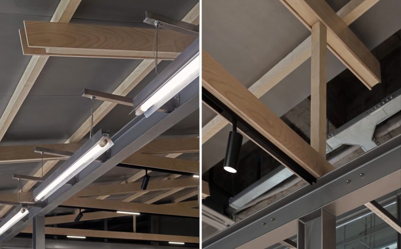 The details, as we understand them, should serve the overall design. The main structure of the “pavilion,” consisting of I-beams and steel columns, visually conveys the volume and weight of the space, and at the same time, forms the structural foundation for all the interior elements. Therefore, the second level of details we introduced is attached to the main construction system—suspended along the steel beams, columns, and trusses, forming light fixtures, seating, and shelving. Electrical outlets and switches are also parasitically attached to the steel columns.