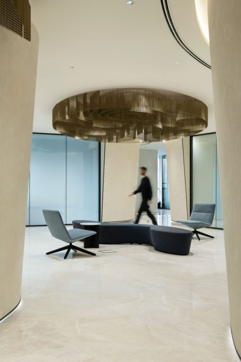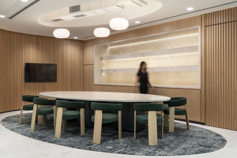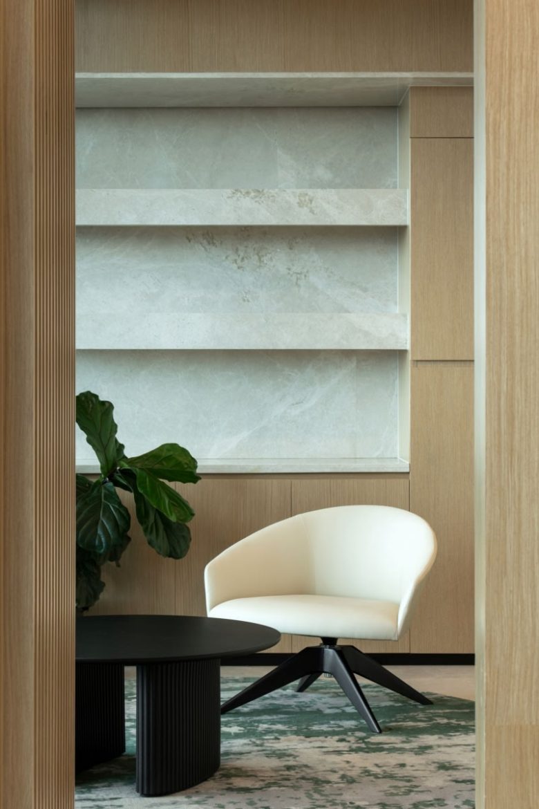 The spatial planning is fluid, simulating the gentle movement of water streams, while walls subtly tilt to emphasize curved and organic shapes. A neutral palette inspired by sand, vegetation, and water sets a calm and balanced backdrop, grounding the workspace in the ecosystem that shaped the city. Materials were chosen to strengthen the connection to nature and place. Grey marble has been used to mimic the natural bed of the lake, while ribbed wooden panelling recalls the woods that once surrounded these water bodies, adding both warmth and texture to the space.