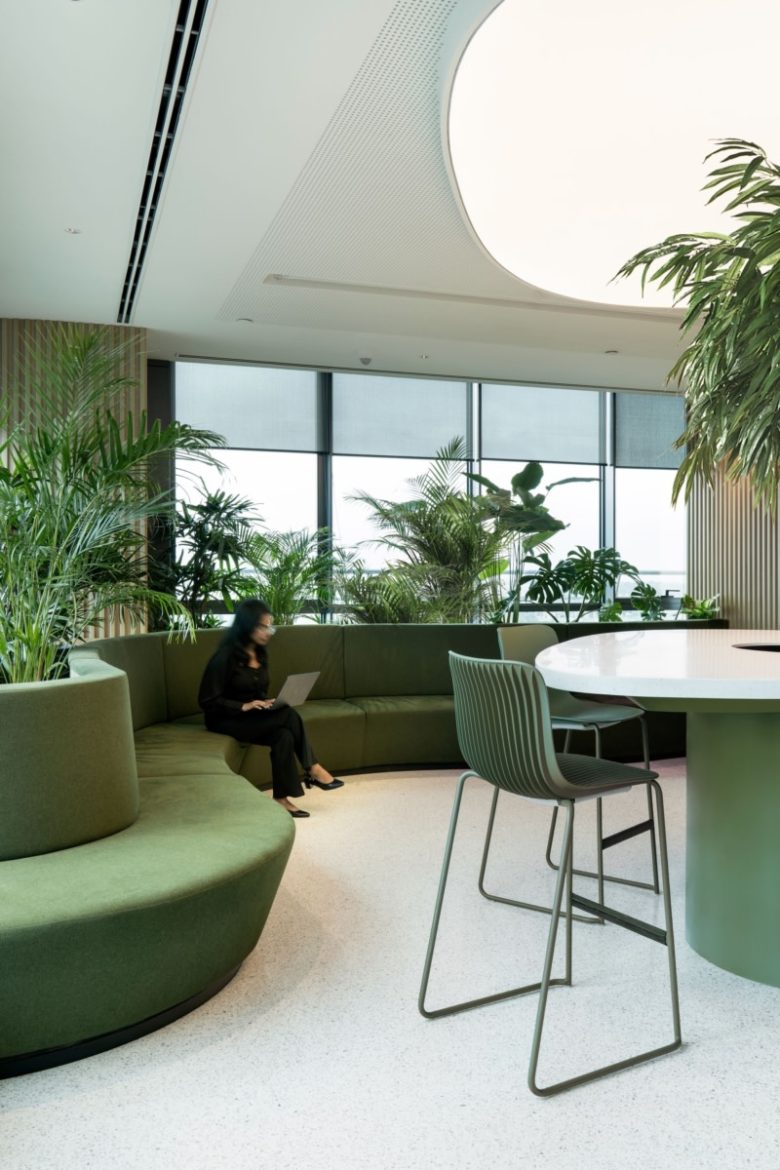 To foster collaboration and focus, the design integrates islands of teamwork framed by expansive bookshelves, housing the firm’s vast legal volumes for easy access. A variety of working setups have been provided to support different needs and working styles. These include high desks with ergonomic high stools for dynamic postures, alongside more traditional seating arrangements, ensuring that employees can choose the environment that best suits their comfort and task. The cafeteria extends the workplace experience, filled with natural light and lush greenery, inviting employees to use it not only for breaks but as a versatile space for connection, creativity, and well-being throughout the day.